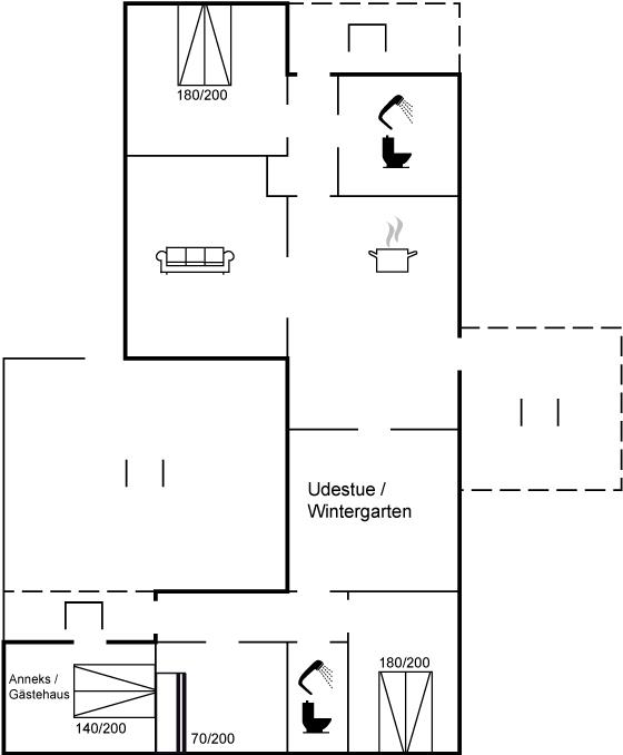 Bemærk, at 2 af de i alt 8 sovepladser befinder sig i husets anneks, hvortil der er adgang via terrassen.