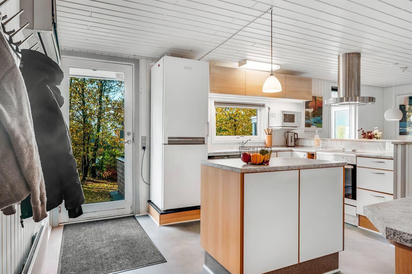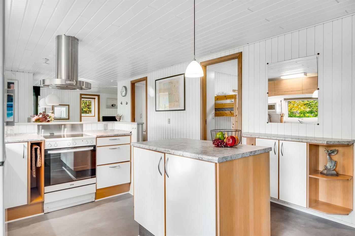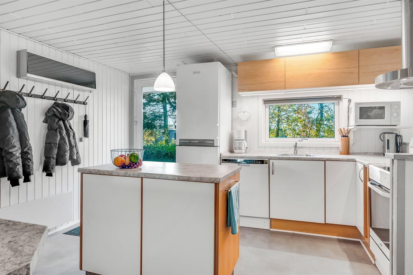 Køkkenet er udstyret med 1 køleskab. Der er 4 induktionskogeplader, varmluftovn, mikrobølgeovn samt opvaskemaskine.