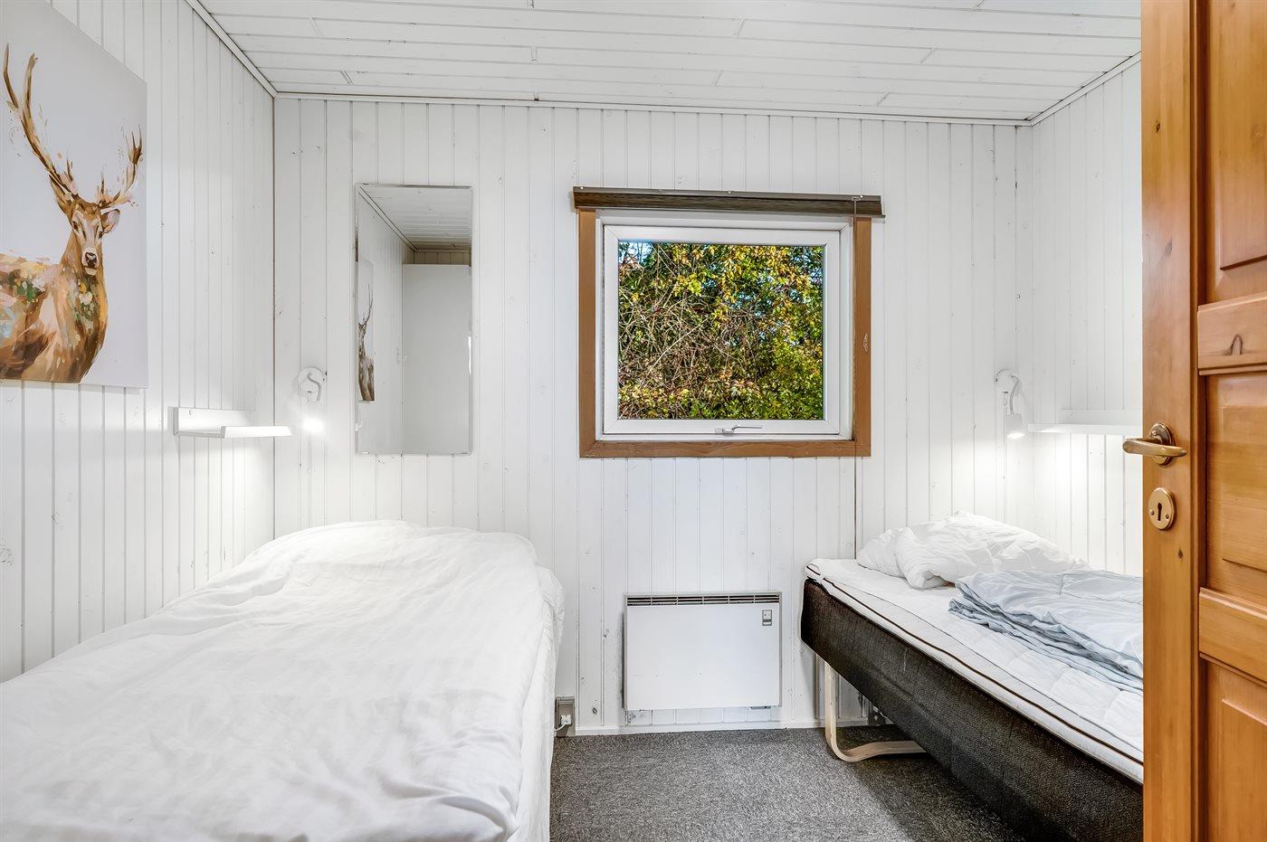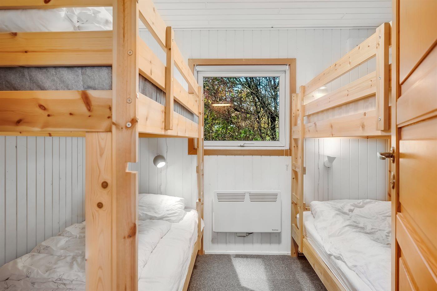 Der er i alt 3 soveværelser. Sovepladserne fordeler sig på: 2 sovepladser i dobbeltseng. 2 sovepladser i enkeltsenge. 4 sovepladser i køjesenge. Derudover er der 1 stk. barneseng.