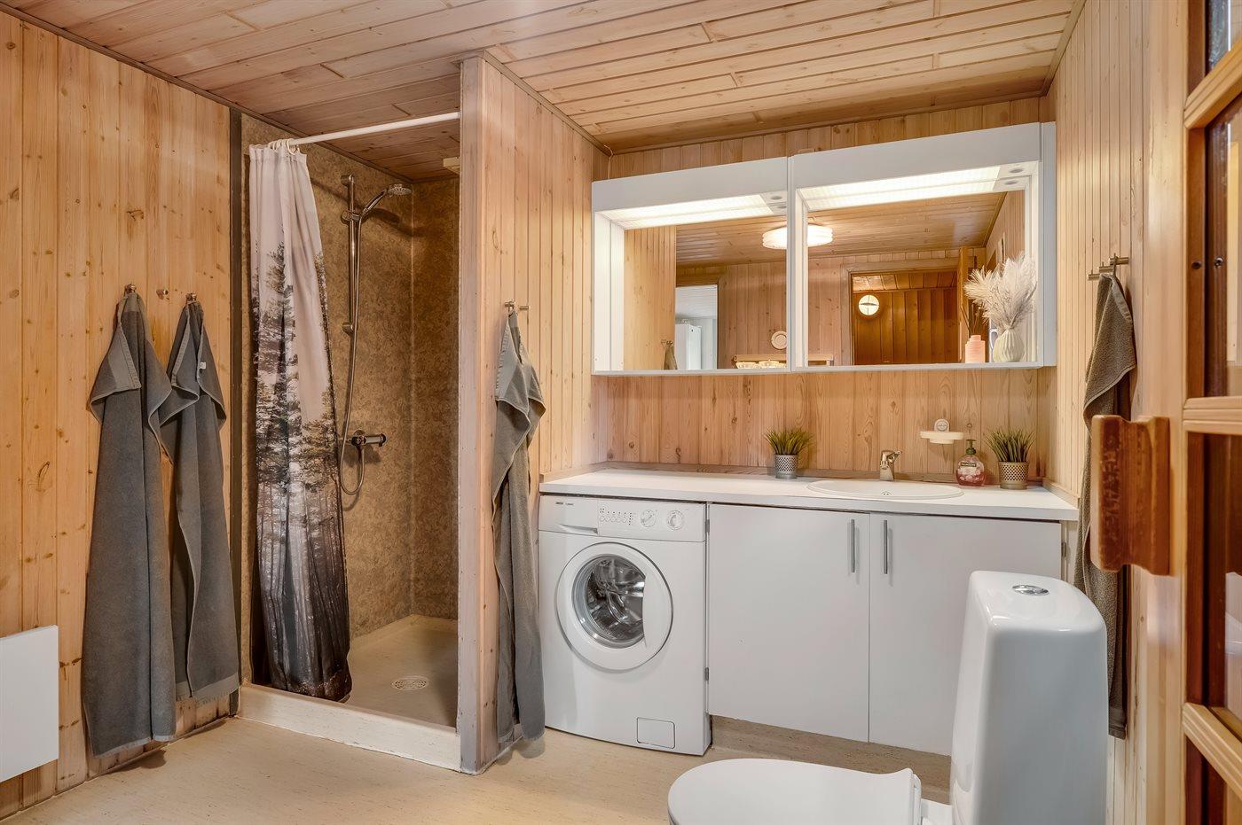 Der er 1 badeværelse med bruseniche og 1 toilet. I saunaen er der mulighed for afslapning.