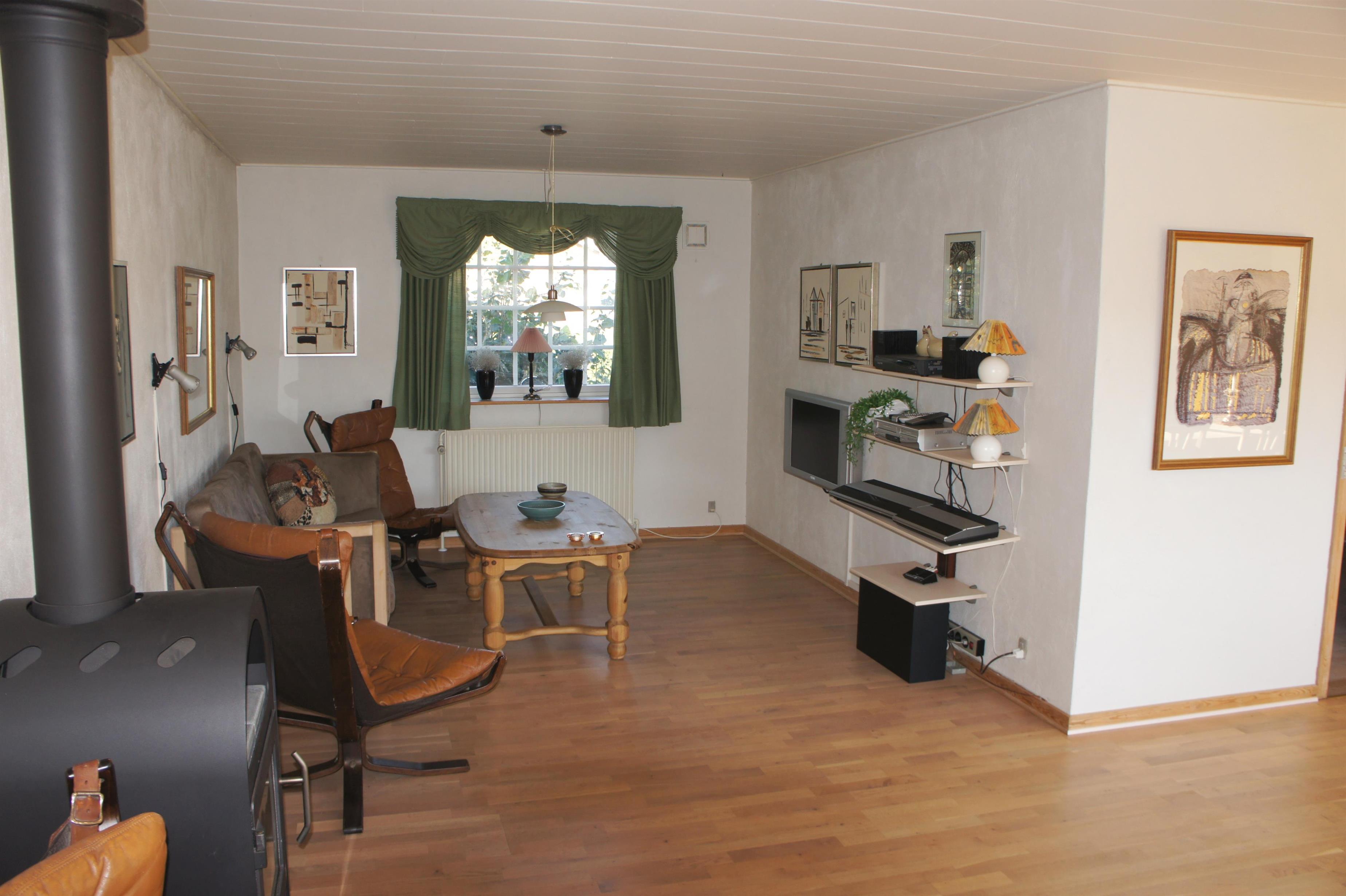 Villaen er fint indrettet m. vinkelstue med parketgulv, mulighed for internet, sofaarangement,4 relax-stole, spiseplads og udgang til terrasse.