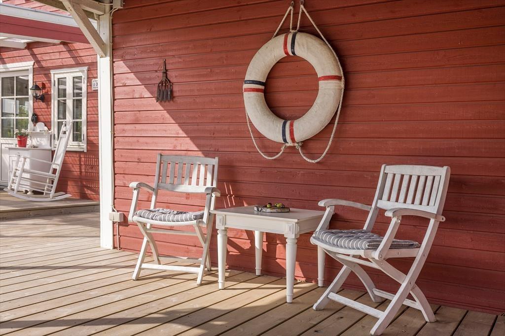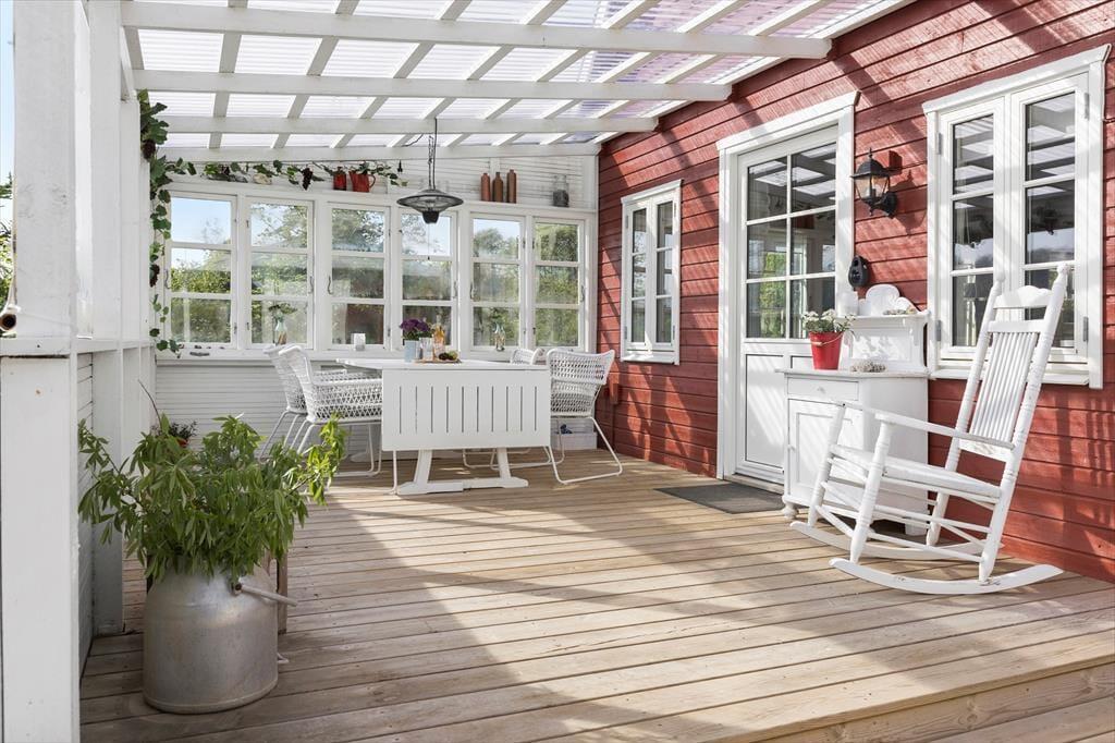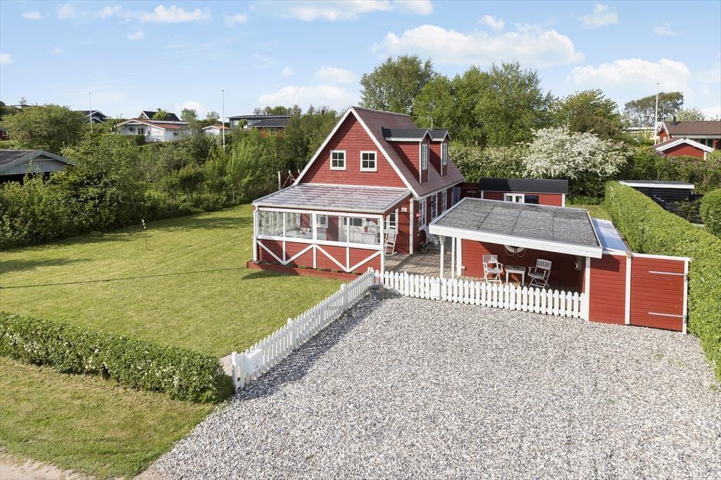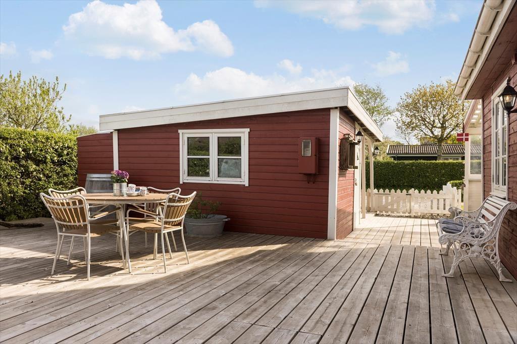 På sommerhusets grund har du alt, hvad du skal bruge for at nyde det milde eller ligefrem varme vejr: Græsplænen er god og plan, hvis børnene vil lege eller udfordrer de voksne i en omgang vikingespil. Trænger du til en tilbagelænet stund med en god bog, er havens hængekøje måske det helt rette sted at slå sig ned – og ellers er der flere skønne opholdspladser på den store og ugenerede terrasse. Lige ud for indkørslen ligger der en overdækket terrasse, men mon ikke terrassen i forlængelse af stuen bliver førstevalget, hvis du vil sidde i læ? Den er i hvert fald samtidig godt afskærmet af vinduesvægge til to sider, og det føles nærmest som at sidde i en lys og indbydende havestue, når du nyder livet her.