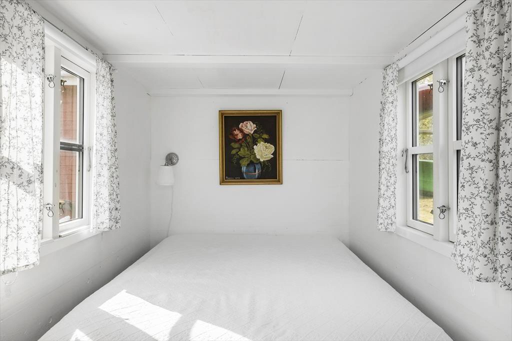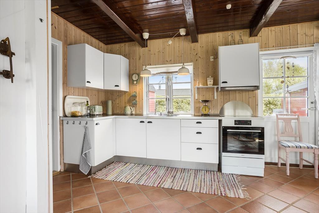 Sommerhuset lyser op midt i alt det grønne med sin røde træfacade og hvide detaljer, og det gennemførte look skærper forventningen om, at der er noget godt i vente indendørs. Her bliver du ikke skuffet, for rummene har en lys og let atmosfære, og indretningen har et personligt og originalt præg, der indbyder til, at du og dine kære tager feriedagene i afslappet tempo. I stueplan ligger stue og køkken samlet, og her er der brændeovn, god loftshøjde og lysindfald fra tre verdenshjørner. Et badeværelse ligger i samme niveau, mens trappen leder dig op til et stort og dejligt soveafsnit, der har charmerende skrå vægge og primært er holdt i hvidt. Soveforholdene passer perfekt til en børnefamilie, for sengepladserne ligger adskilt af en halvvæg, og der er en ekstra madras i en lille hyggelig alkove – og derudover er der flere sengepladser i husets gode anneks.