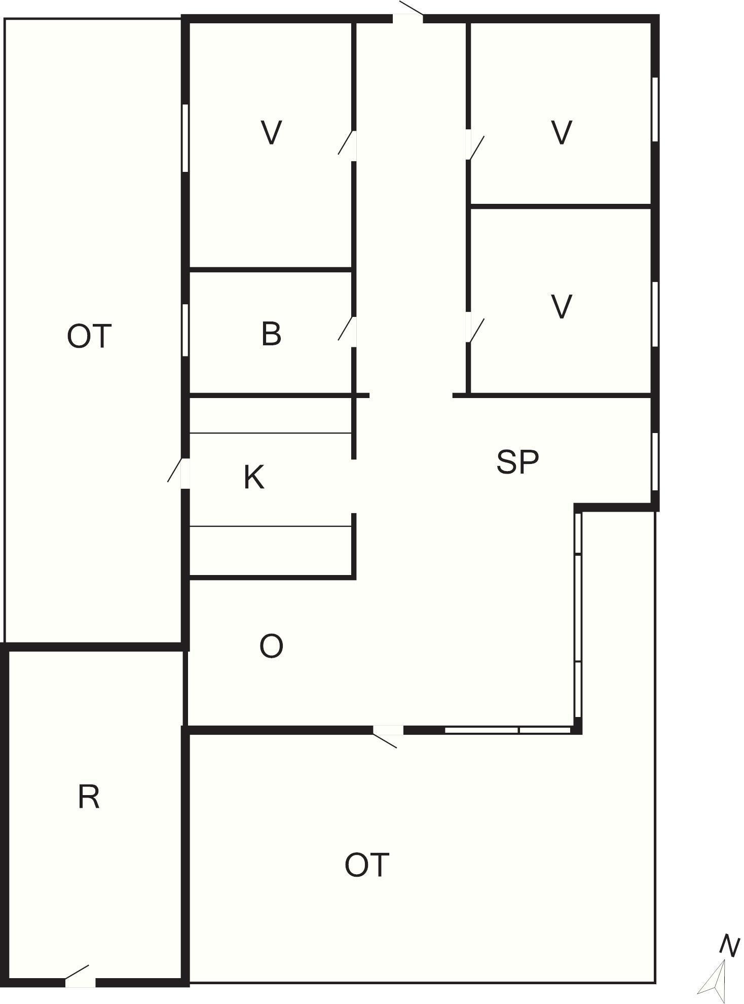 Det lyse og indbydende indrettede feriehus er praktisk indrettet med kombineret stue/spisestue og køkken. Køkkenet giver udgang til den bageste terrasse.