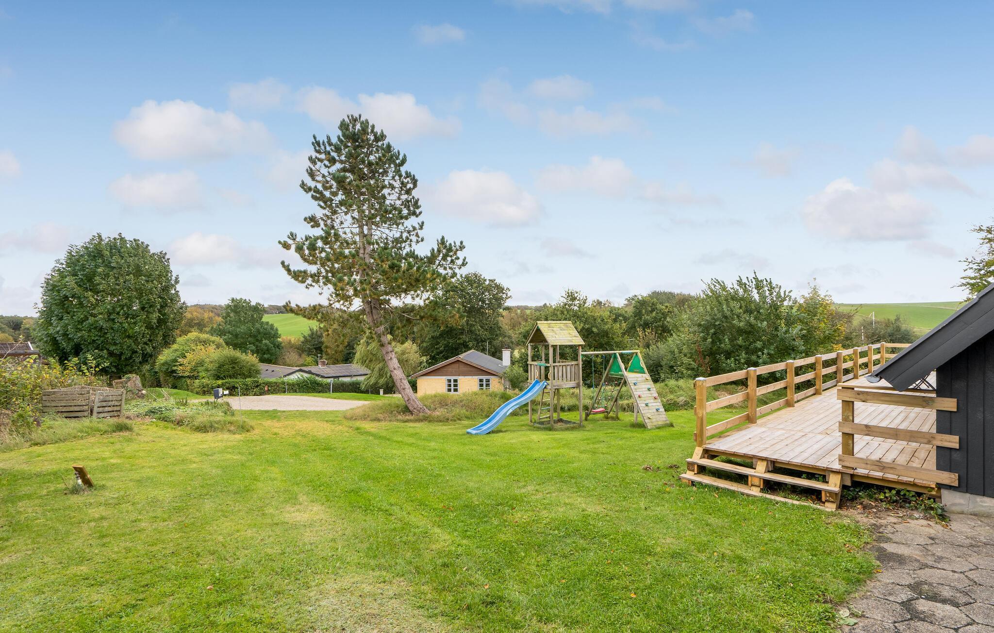 Huset ligger på en ugeneret naturgrund ud til åbne marker. Glæd jer til den flotte, store træterrasse og slip børnene løs i haven, hvor der er et legetårn, som de sikkert hurtigt vil kaste sig over.