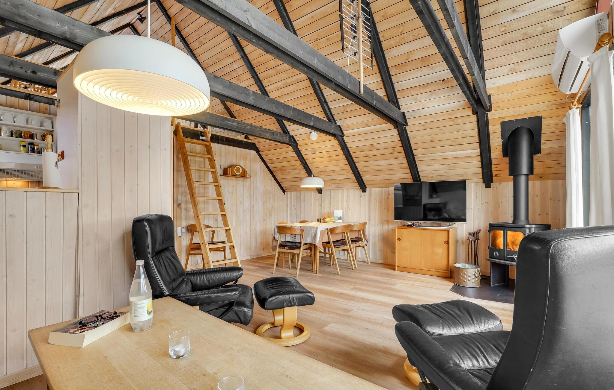 Blot 400 meter fra Limfjordens vande ligger dette feriehus, hvor I virkelig kan trække stikket fra hverdagen. Huset er hyggeligt indrettet med træelementer og en rolig farveskala, som giver ekstra meget plads til lyset og de grønne rammer udefra. Husets hjerte er den åbne opholdsstue, som giver jer et hyggeligt sted at samles efter en lang dag i den friske luft, hvor I mest har brug for at smide benene op og kigger på flammerne i brændeovnen.