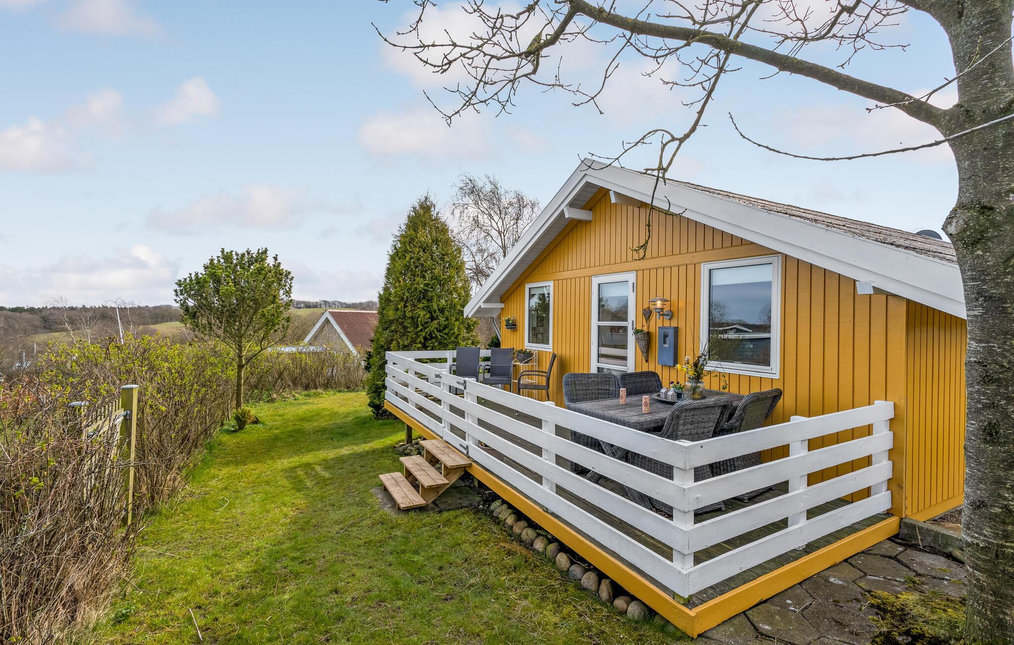 Solgult feriehus i Eskov Strandpark med terrasse, brændeovn og udsigt til landskab tæt på stranden.