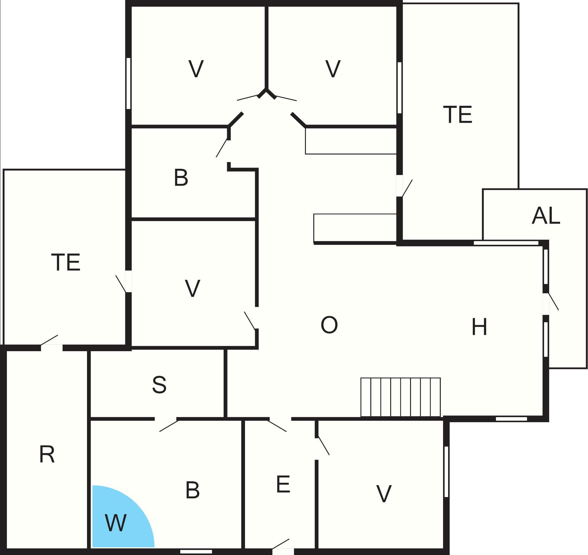 1 Opholdsstue: Brændeovn, tv, høj stol