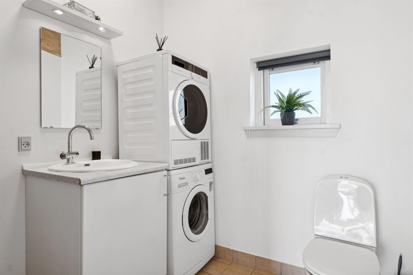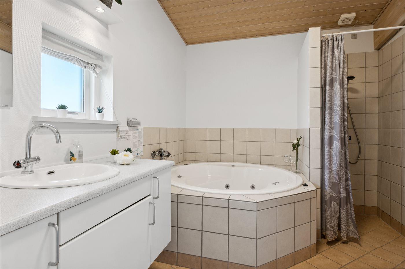Der er 2 badeværelser med bruseniche og 2 toiletter. Der er gulvvarme på 2 badeværelser. I saunaen er der mulighed for afslapning.