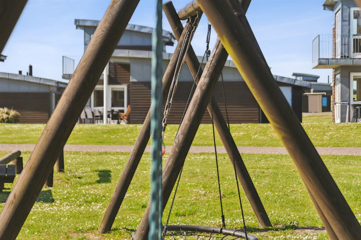 På fællesområdet er der en stor legeplads, og om sommeren er der opsat fælles badebro ved stranden.