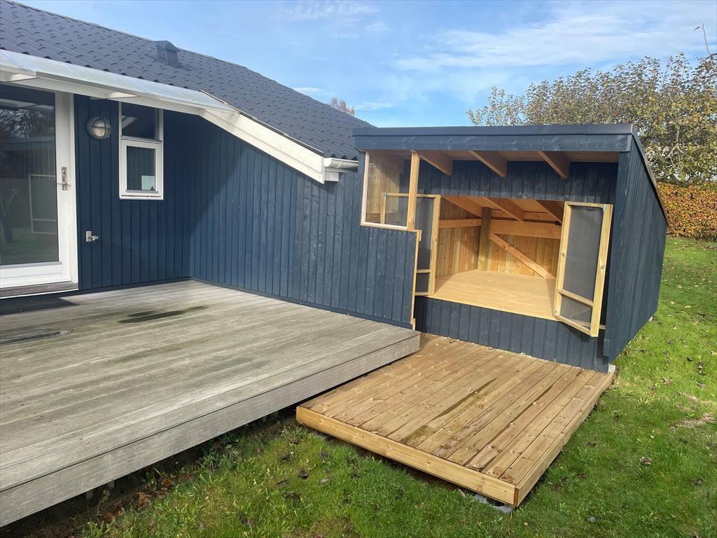 Fra stuen er der udgang til afskærmet og delvist overdækket terrasseareal med havemøbler. Herfra kan man nyde den skønne udsigt over Kalø Vig og Århus Bugten. Fra huset er der kun 250 meter til dejlig strand.