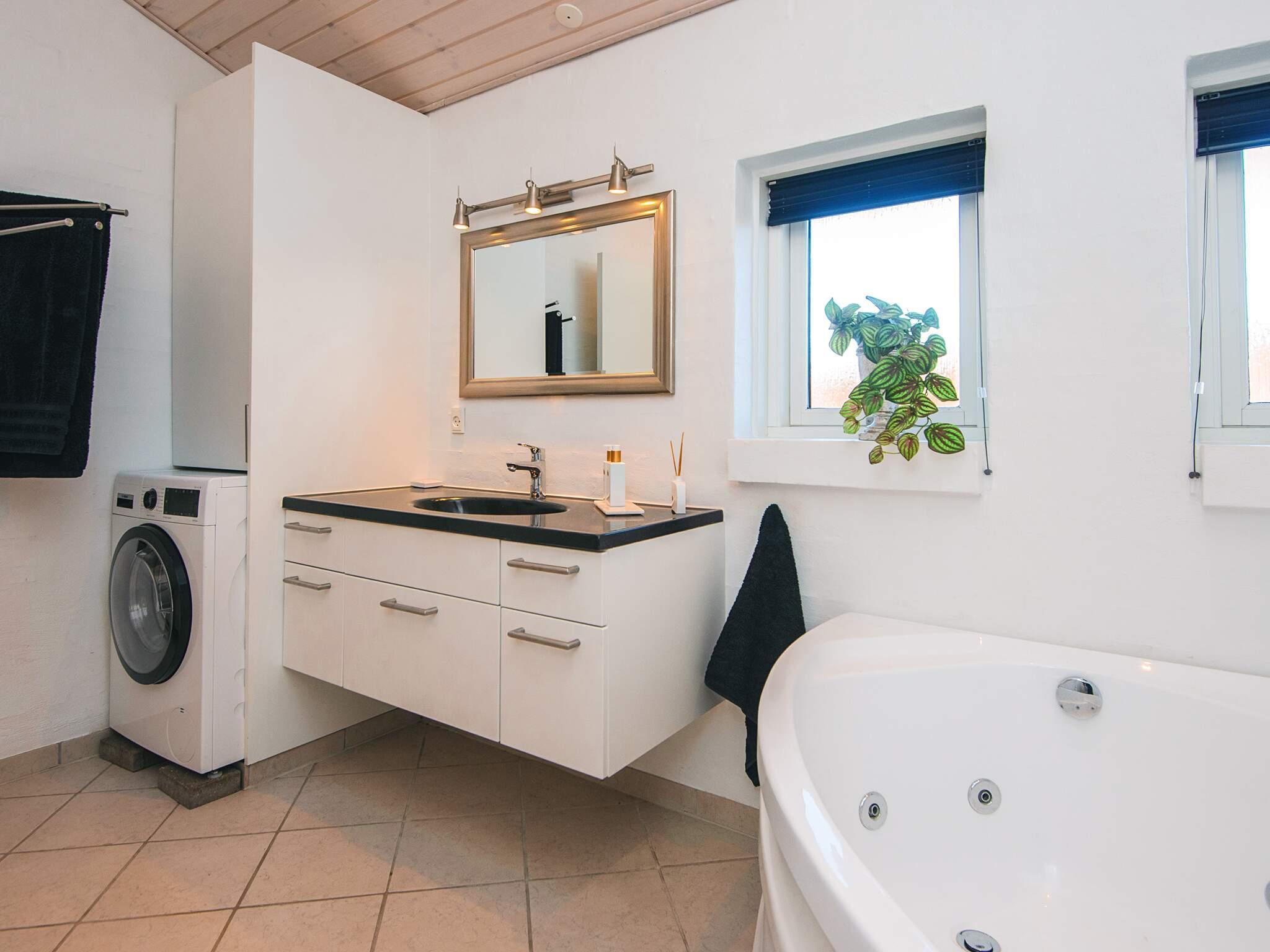 To badeværelser i huset, det ene med vaskemaskine, toilet, håndvask, bruser og boblebad til to personer. Der er også et skab med rengøringsmidler, strygejern og strygebræt.