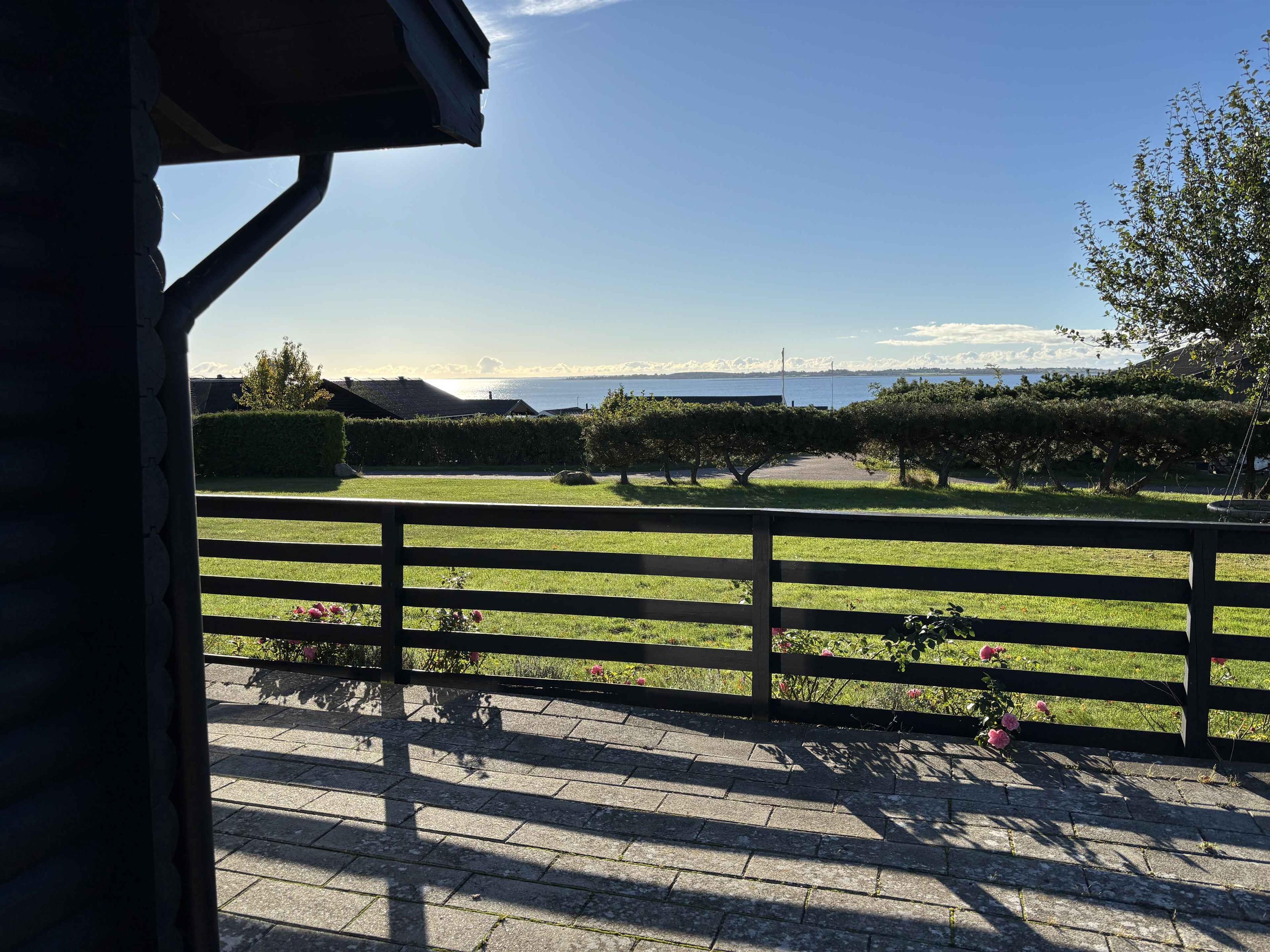 Hyggeligt sort bjælkehus i Horne med panorama havudsigt og stor sydvendt terrasse.