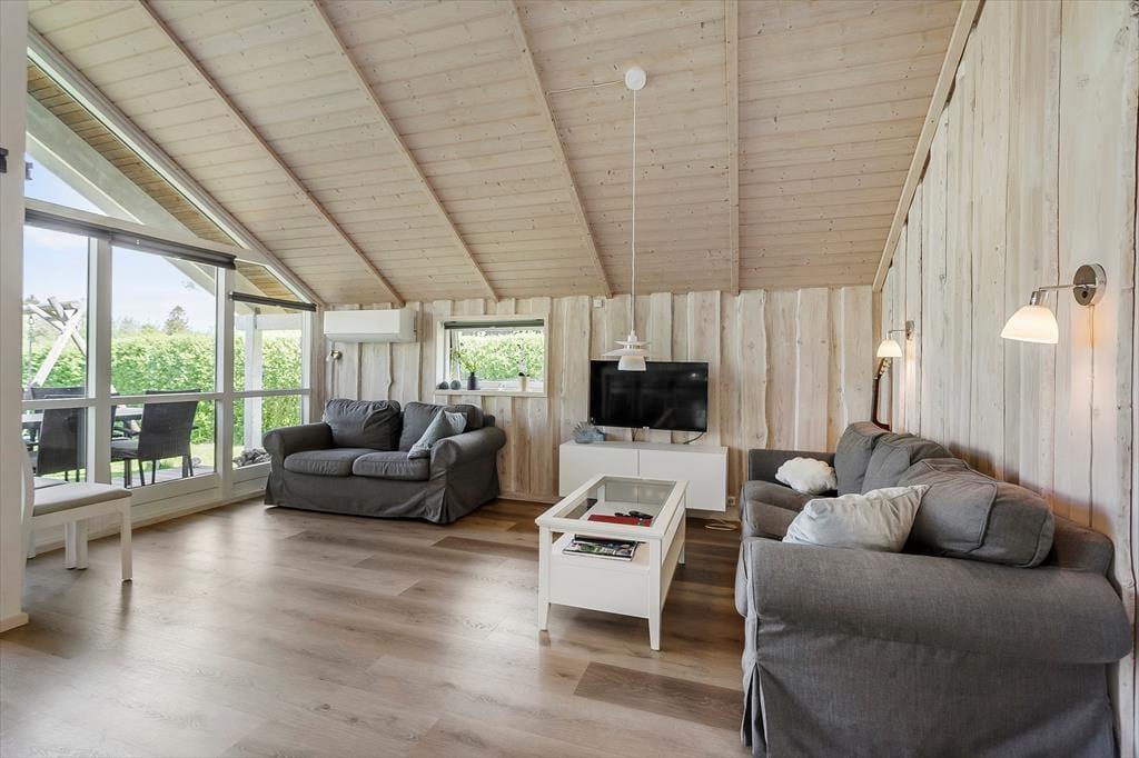 Indenfor finder du en lys og funktionel indretning med 3 soveværelser og en alkove. Her kan I alle være og her er plads til at I kan nyde ferien og slappe af. I stuen kan du læse en bog eller se streaming tv eller blot nyde udsigten til haven, imens du nyder en kop kaffe eller te. Sommerhusets åbne køkken har direkte forbindelse til stuen, så I kan være sammen, imens I tilbereder dagens måltider. Her er et fint badeværelse med brus og spa og endnu et badeværelse med brus, så I ikke skal vente på at teenageren bliver færdig.