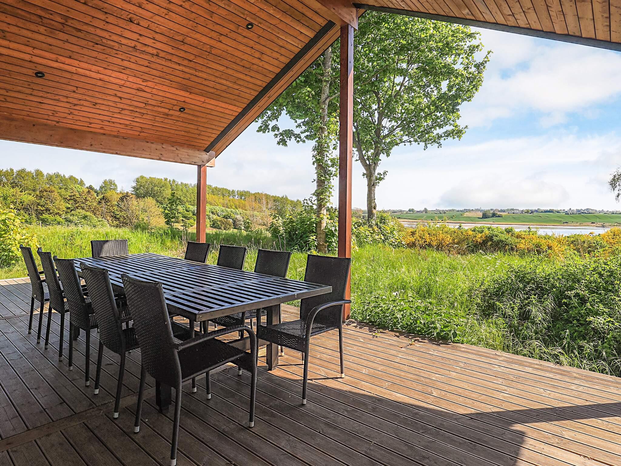 Fra opholdsrummet er der direkte udgang til den store, overdækkede/åbne terrasse med havemøbler og grill.