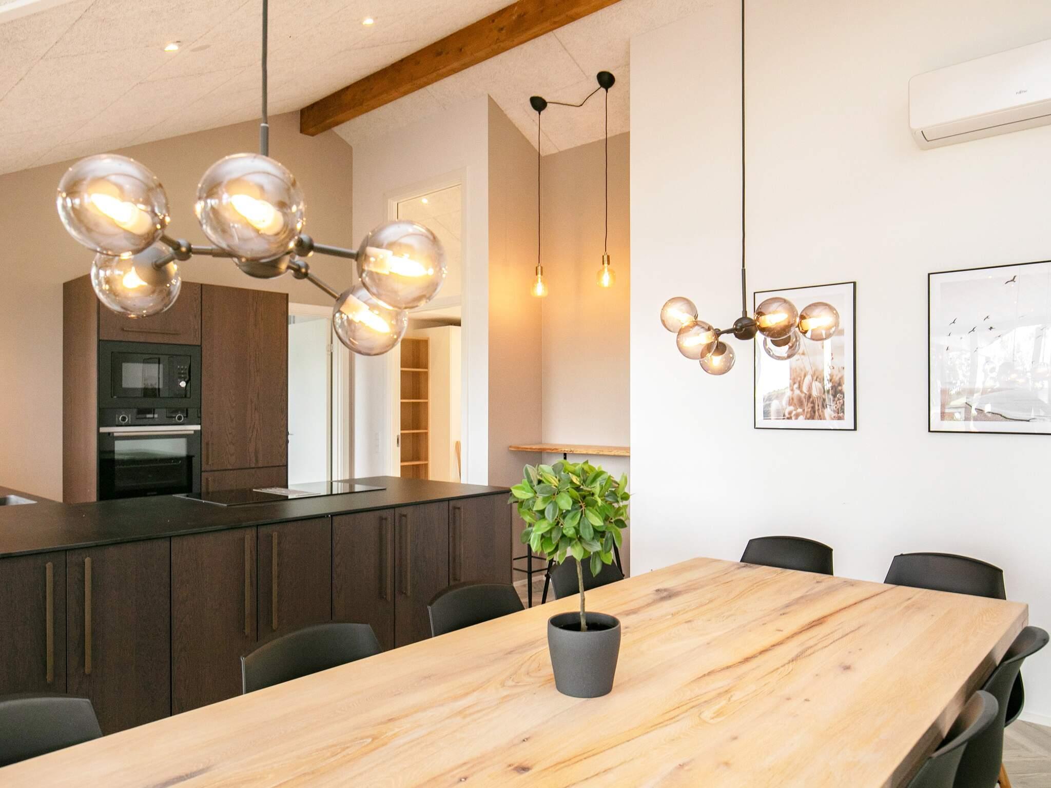 Den veludstyrede køkkenafdeling har bl.a. opvaskemaskine, keramiske kogeplader og mikroovn. Der er stor, kombineret opholds/spisestue møbleret med møbler af dansk kvalitet samt stort tv med Chromecast, så I kan streame egne tjenester. Der er fibernet i huset.