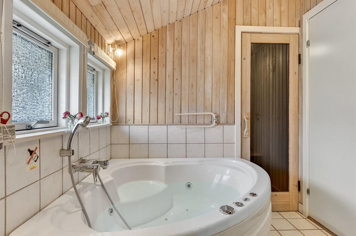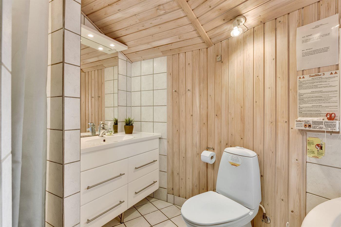 Der er 1 badeværelse med bruseniche og 2 toiletter, heraf 1 gæstetoilet. Der er gulvvarme på 1 badeværelse. Der er gulvvarme på gæstetoilettet. I saunaen er der mulighed for afslapning.