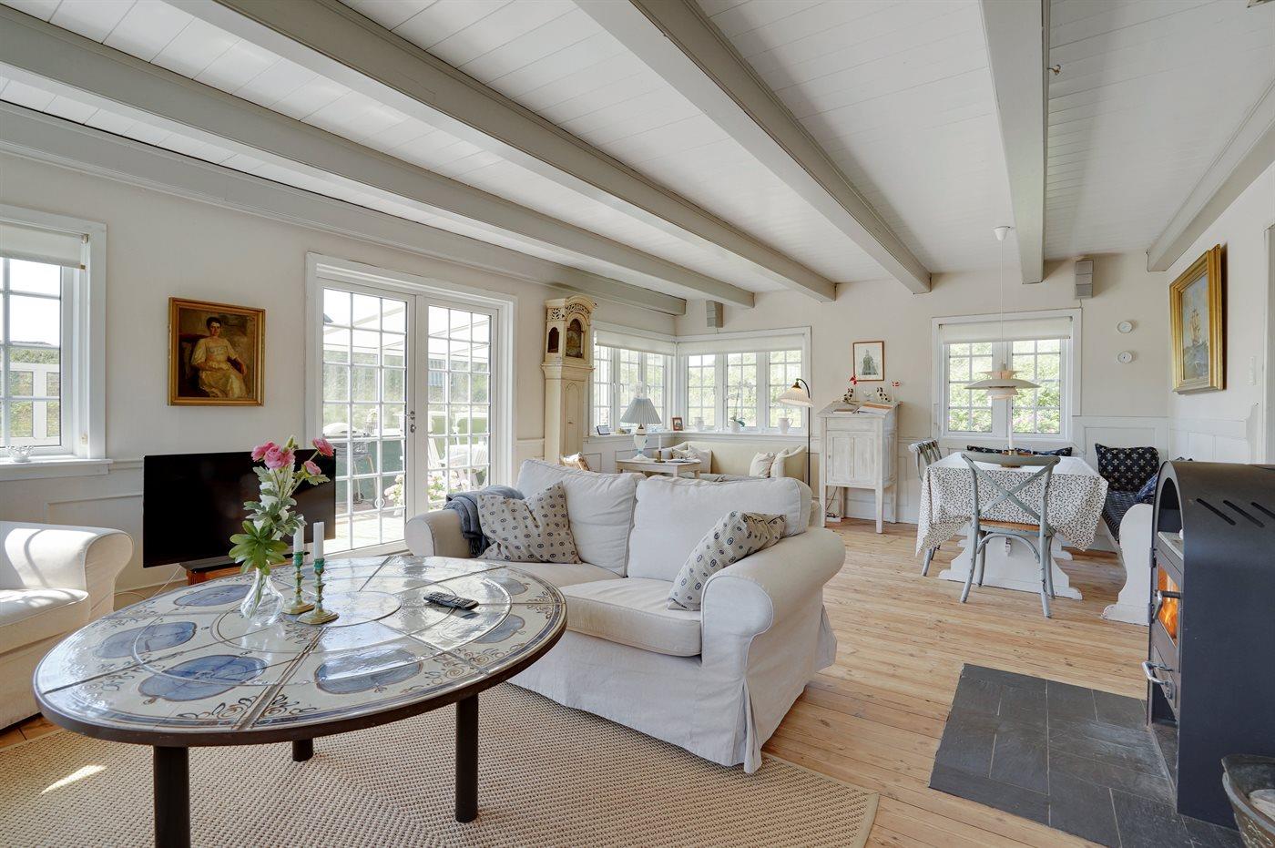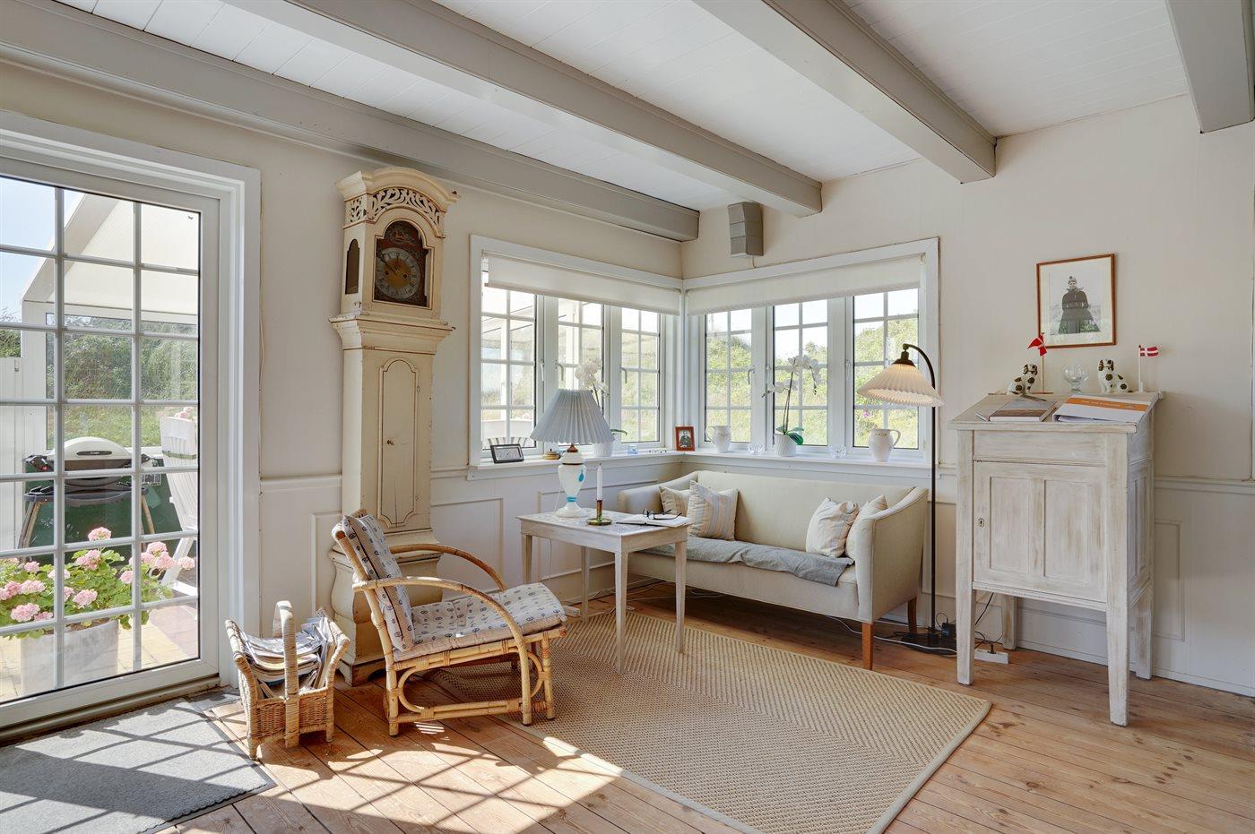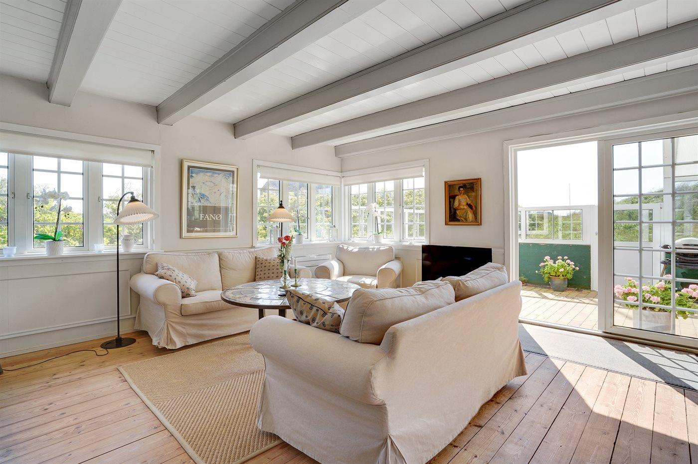Pragtfuldt og charmerende Fanøhus med 1. sal. Huset er særdeles smagfuldt og hyggeligt indrettet. Skøn beliggenhed på klitgrund, hvorfra der er havkik. Rigtig gode terrasser: Én er delvist overdækket.