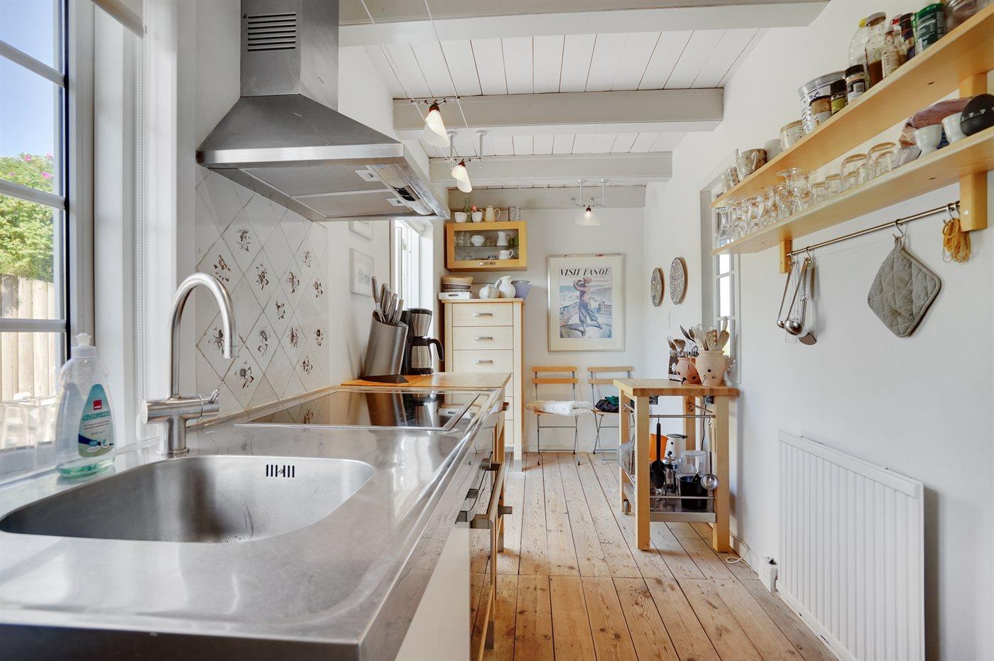 Køkkenet er udstyret med 1 køleskab. Der er 4 keramiske kogeplader, bageovn, mikrobølgeovn samt opvaskemaskine.