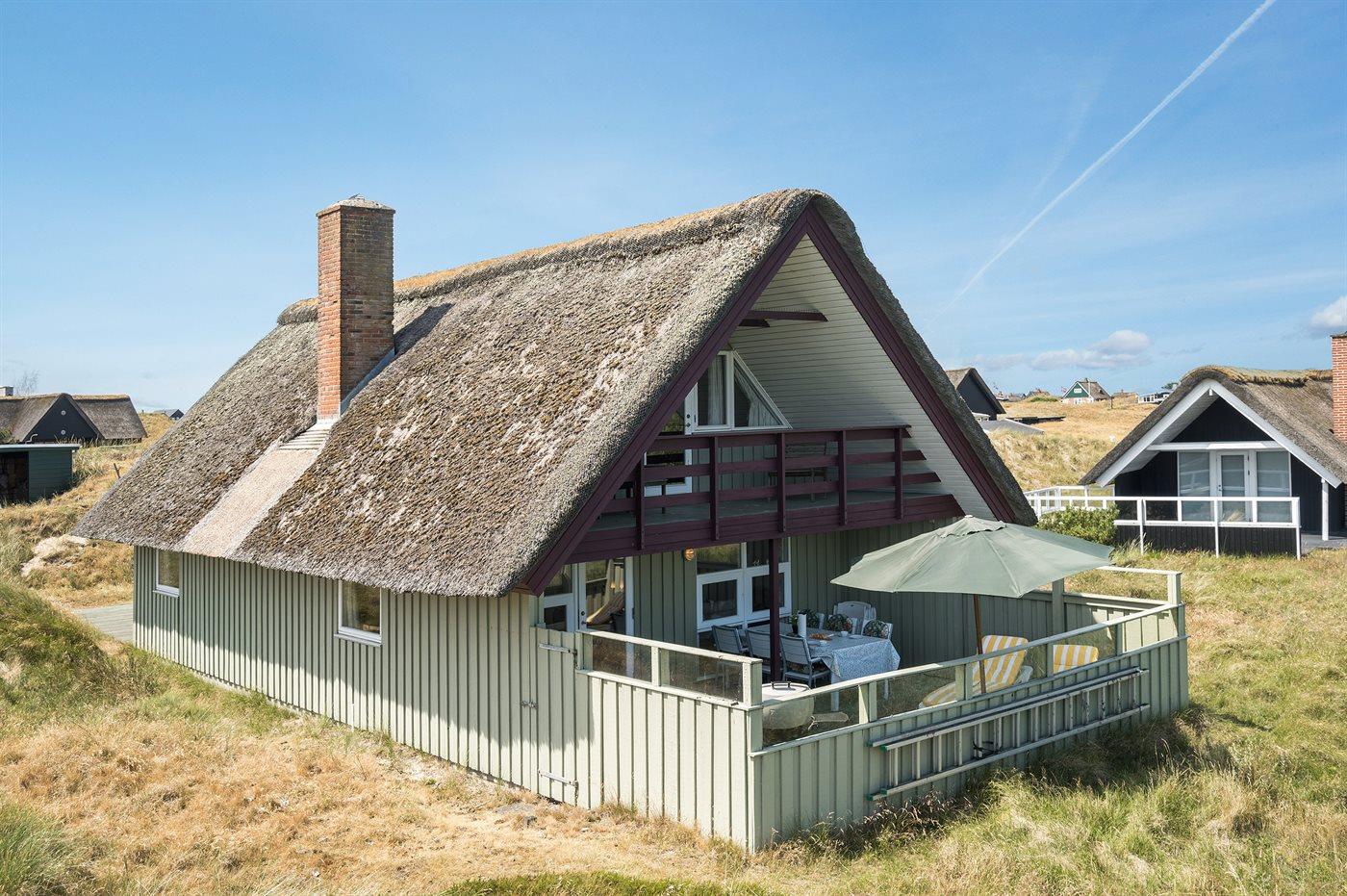 Dette dejlige veludstyrede stråtækte hus er smagfuldt og lyst indrettet. Huset ligger pragtfuldt på stor naturgrund ved en lille sø. Ekstra toilet på 1. sal. Fra det store soveværelse med dobbelt seng er der udgang til balkonen. Herfra en flot udsigt. Fra husets store lukkede terrasse og balkonen kan man nyde områdets rige dyreliv.