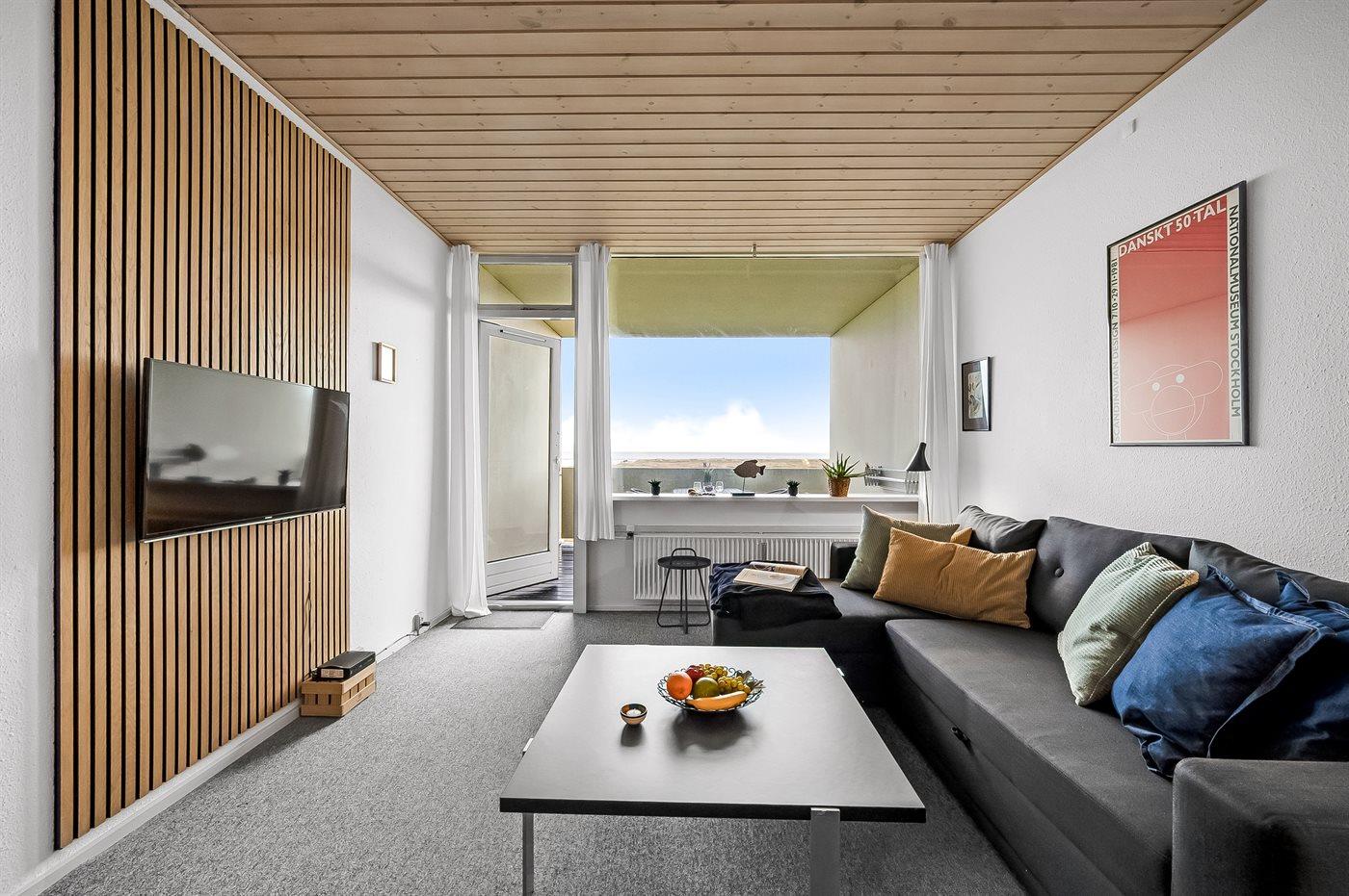 Attraktiv ferielejlighed beliggende på 1. sal med en pragtfuld udsigt over hav og klitter. Lejligheden ligger ca. i midten af blokken med udgang til skøn træbelagt terrasse, hvor man kan sidde det meste af året. Fællesfaciliteter: Udendørs pool, som er opvarmet med solvarme, indendørs pool samt børnepool, sauna, vaskerum med tørretumbler og strygemulighed, gratis internetadgang, aktivitetsrum med bl.a. bordtennis, legerum, air-hockey. Dejlige udendørsarealer med grill, borde-bænke og petanquebane samt legeplads med sandkasse, rutschebane og legetårn.