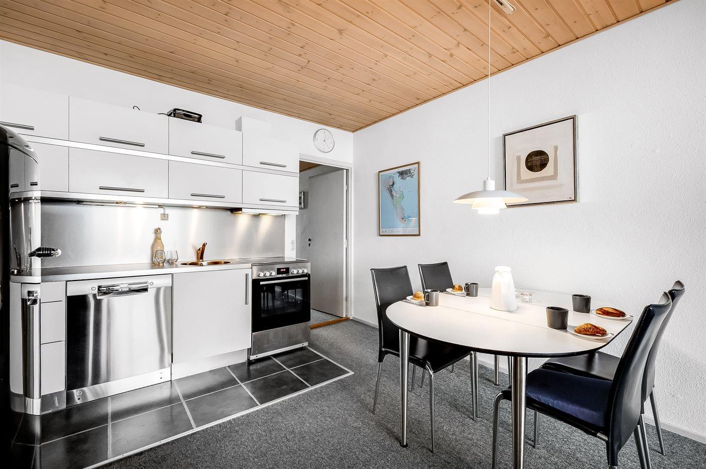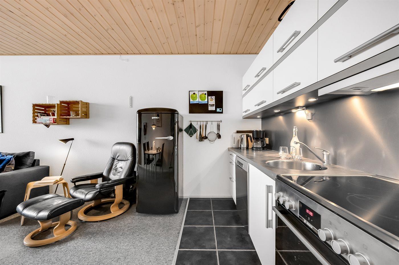 Køkkenet er udstyret med 1 køleskab. Der er 4 keramiske kogeplader, varmluftovn samt opvaskemaskine.
