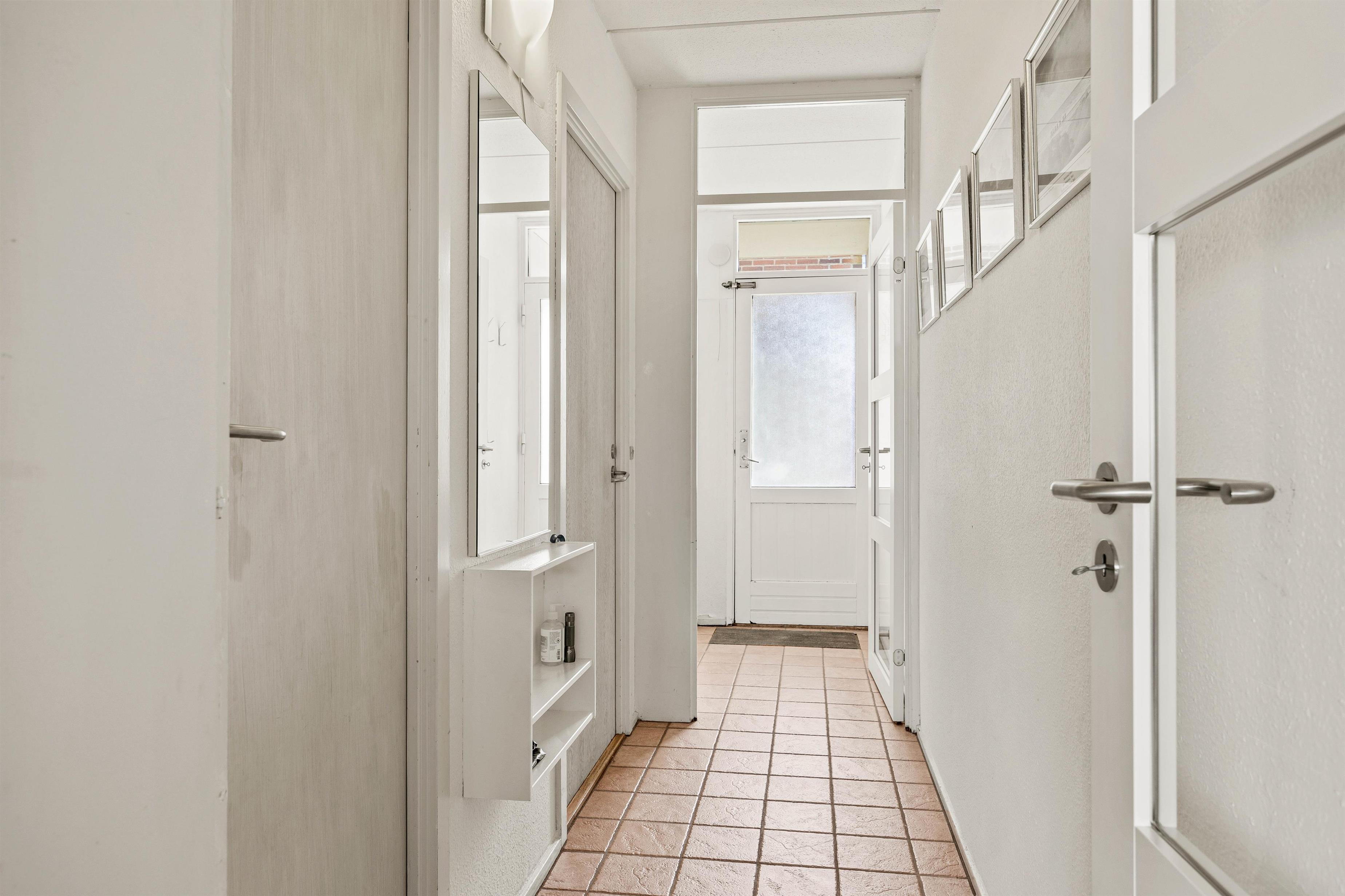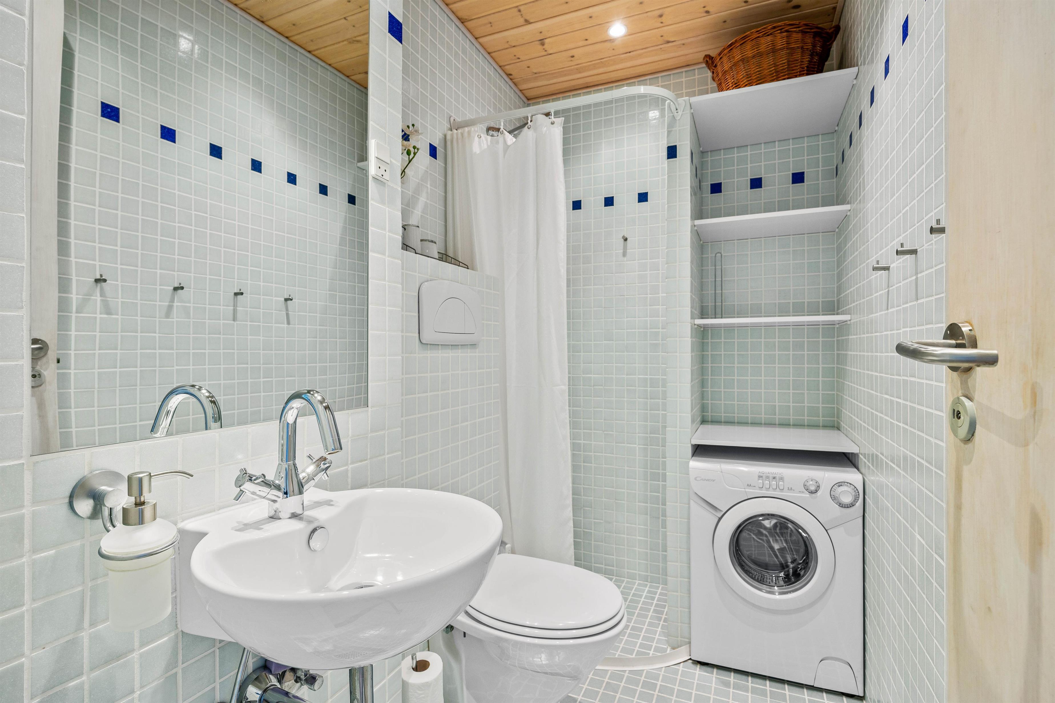 Der er indlagt gulvvarme i badeværelset med bruseniche, så ingen behøver at fryse om fødderne. Badeværelsest har også egen vaskemaskine.