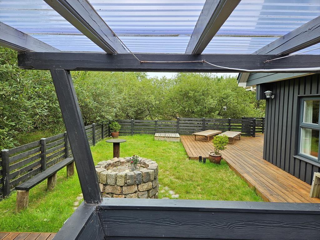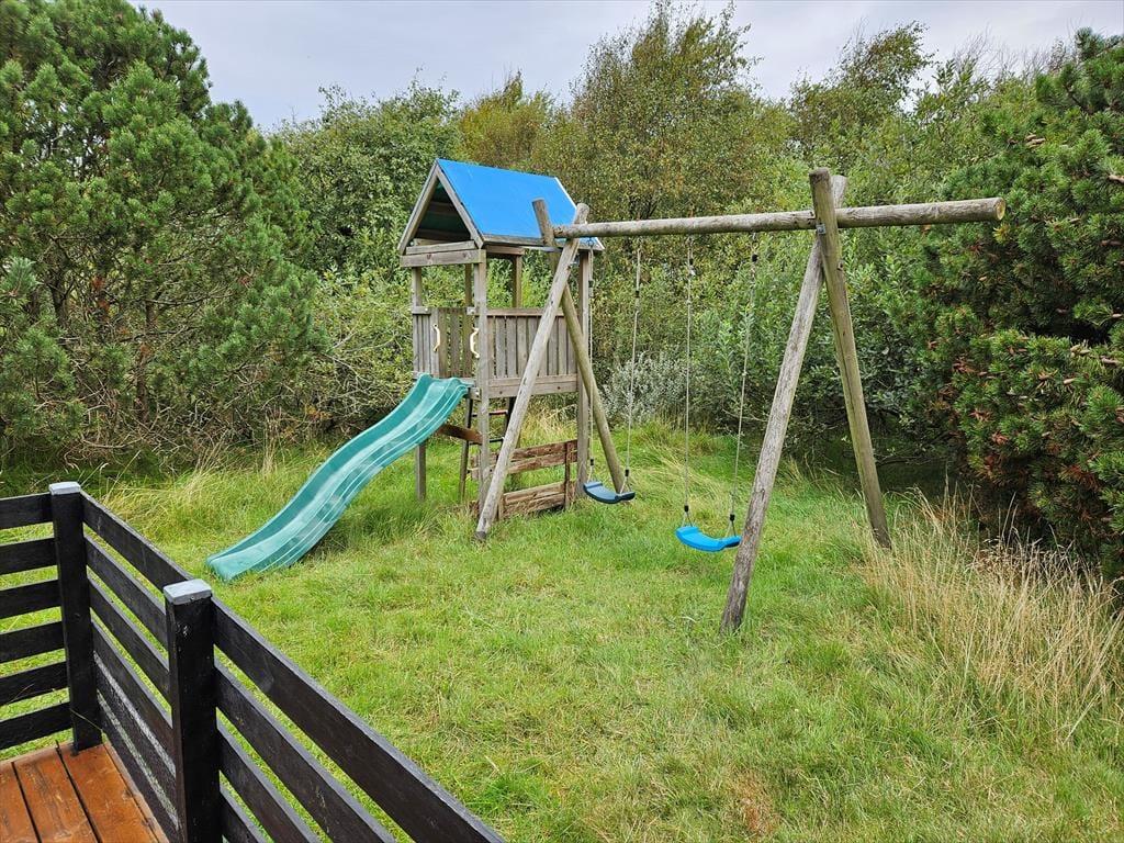 Naturgrunden er en tillokkende oase for hele familien, for i læ af træer og buske er der legeredskaber, et bålsted og flere dejlige terrasseområder – ja, i årets våde måneder har huset endda sin egen lille sø, der fuldender den naturskønne sommerhusromantik! Børnene kan hygge sig med at gynge, klatre og rutsje, og hvis du ikke er klar på at tage del i legen, kan du sidde lige i nærheden med en god kop kaffe. Om aftenen kan I hjælpes ad med at grille, og bordet kan I dække enten på den åbne terrasse mod vest eller på det hyggelige, overdækkede opholdsareal.