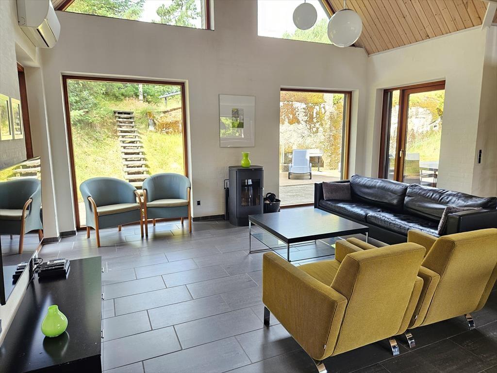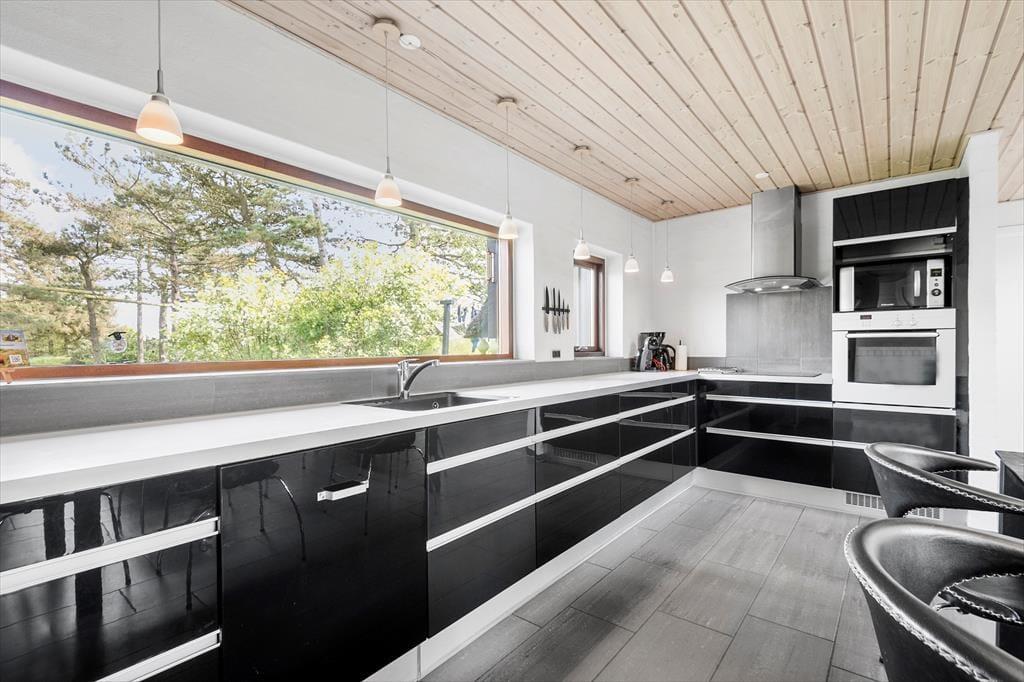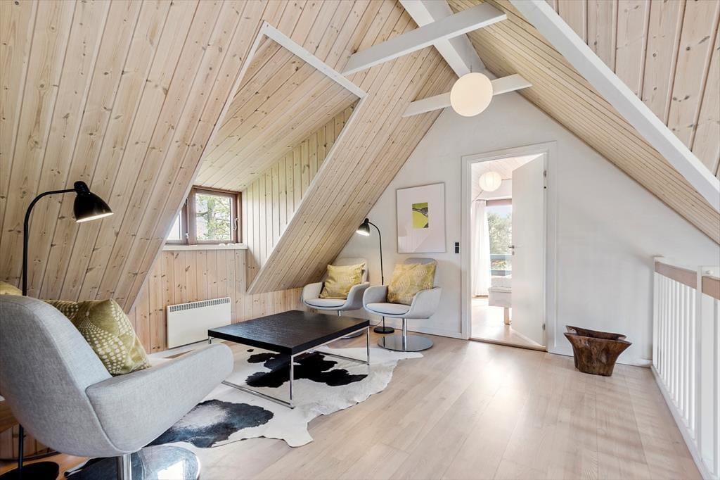 De udendørs arealer er noget helt særligt, for den grønklædte grund er kuperet, og en gammel bunker er endda bygget ind i terrænet. Hvis du vil nyde udsigten over landskabet, kan du sætte dig op på toppen, og ellers er husets nærmeste terrasser også dejlige steder at sidde – for eksempel på det sydvendte område, hvor du kan slikke sol i de ugenerede omgivelser. Det bliver helt sikkert spændende for børnene at lege og gå på opdagelse mellem naturgrundens bevoksning, og til de yngste er der både gynge og sandkasse, så de har noget at hygge sig med.