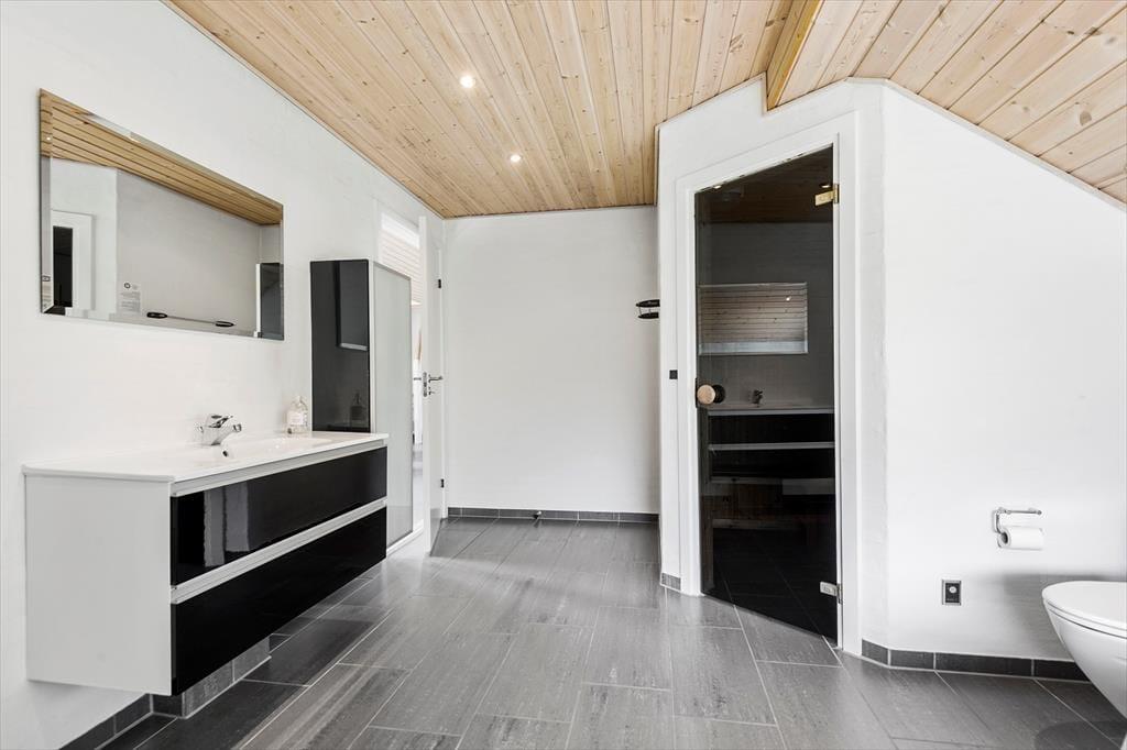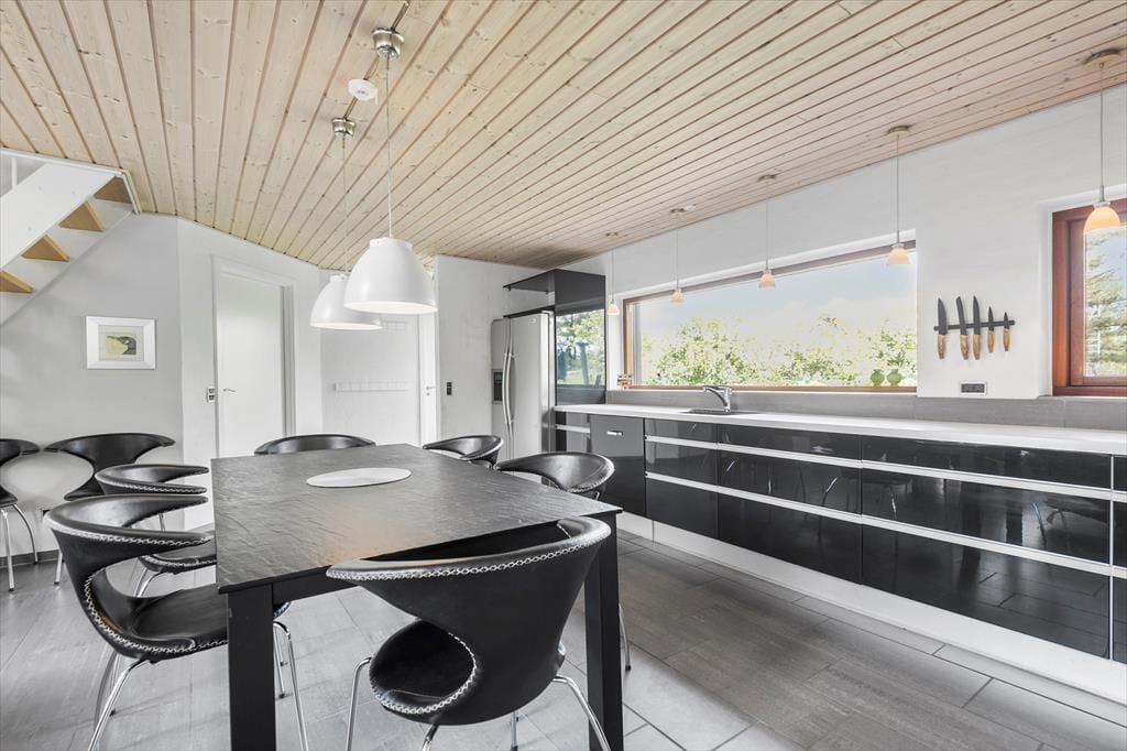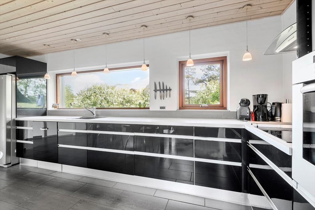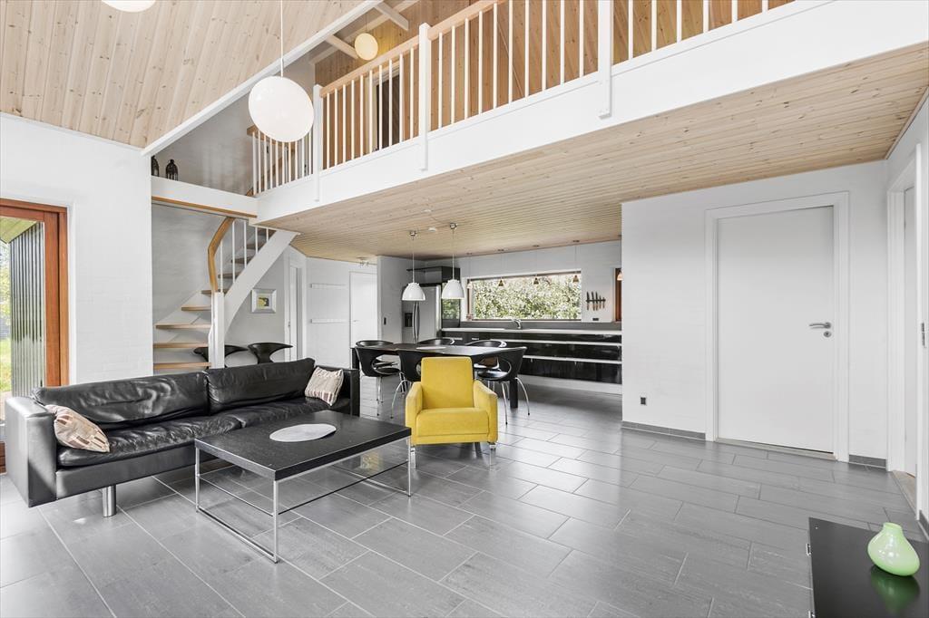 Det 155 m2 store sommerhus er opført i 2007, og det har en både elegant og komfortabel indretning med moderne møblement og lækkert design. Rumfordelingen gør huset ideelt til to familier, for de fire soveværelser og to badeværelser er ligeligt fordelt på to etager – og på førstesalen finder du for øvrigt en lille udsigtsstue, mens stueplan byder på et dejligt opholdsrum med integreret køkken. Uanset hvor du befinder dig, er der dejligt at være inden døre: Er det køligt udenfor, kan du tænde op i brændeovnen eller koble helt af med varme spabade og saunature. Og hvis solen skinner udenfor, får du glæde af vinduernes smukke lysindfald, medmindre du rykker driverlivet helt ud på den skønne naturgrund.
