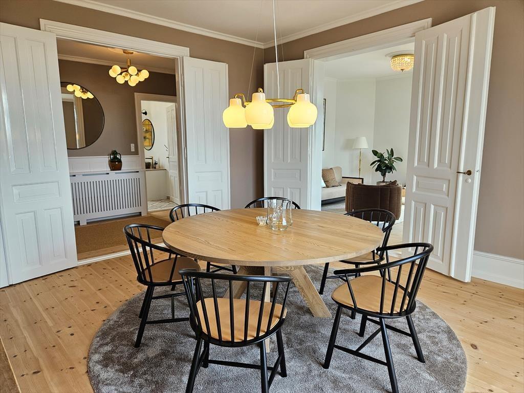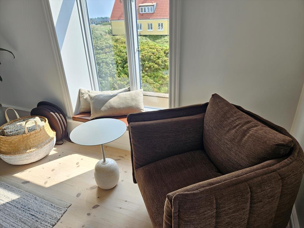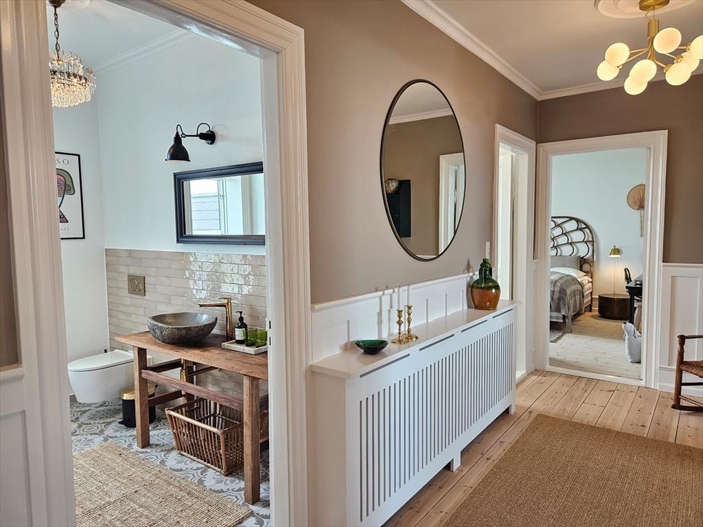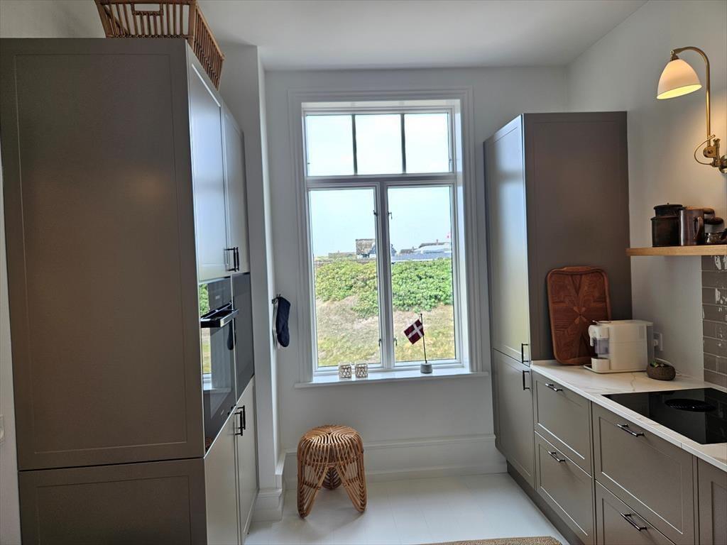 SOLNEDGANGEN er indrettet med et skarpt blik for æstetik og komfort. De høje paneler, de store vinduespartier og det nøje udvalgte møblement skaber en varm atmosfære, hvor lyset fra havet altid er en del af rummet. I opholdsstuen kan du nyde udsigten i de bløde sofaer, og spisestuen indbyder til lange måltider. Køkkenet er fuldt udstyret med alt fra quooker og vinkøleskab til Nespresso-maskine. Soveværelserne har Hästens-senge, og boligen rummer både et badeværelse og et separat toilet, så alle kan starte dagen i eget tempo.