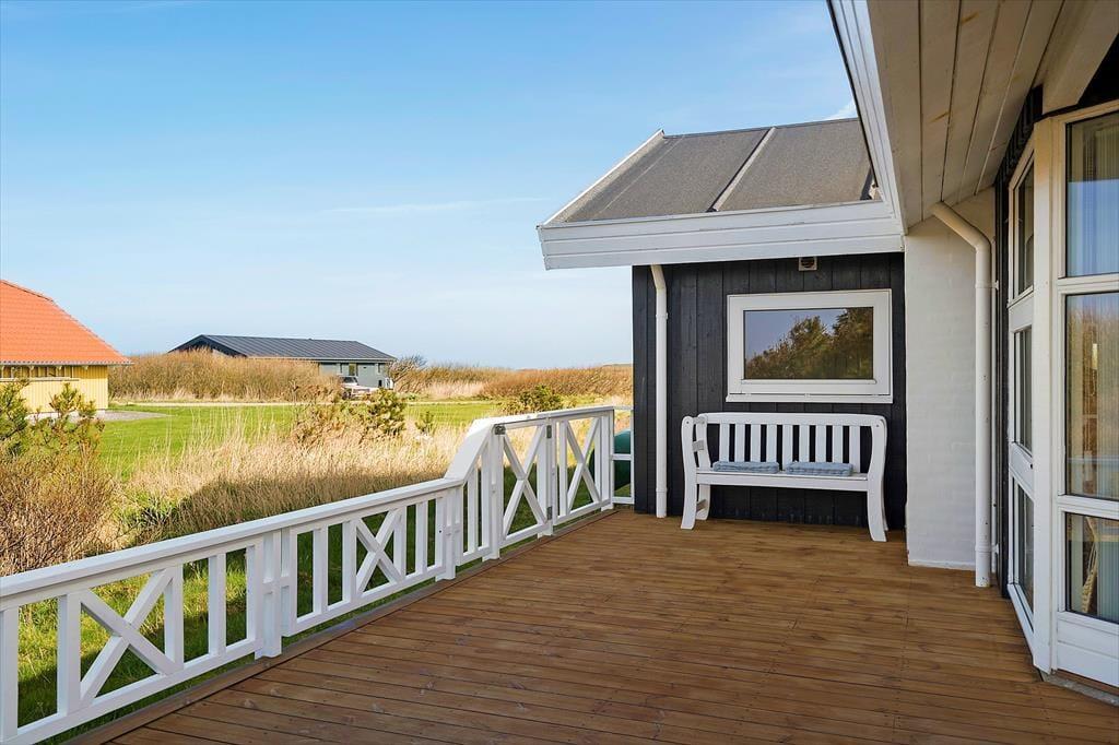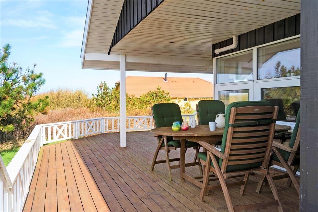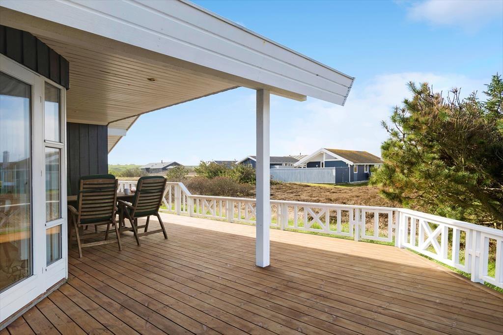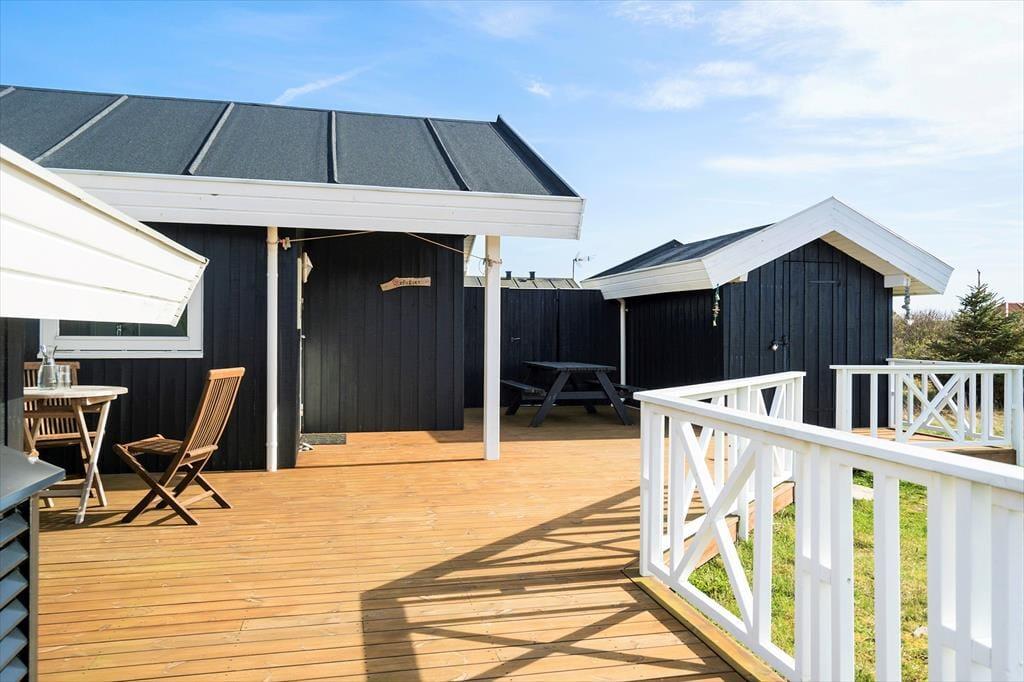 Udendørs venter der jer noget helt særligt. Den store, flotte træterrasse omkranser huset og fungerer som en ekstra stue i sommerhalvåret. Her kan du dase i liggestolen, mens solen varmer huden, eller nyde lange måltider under åben himmel, når aftensolen bader landskabet i gyldent lys. Den generøse størrelse gør det nemt at finde en hyggelig og ugeneret krog – hvad enten du foretrækker morgenkaffe i ro og fred eller grillhygge med hele familien. Børnene har masser af plads at boltre sig på, og med den korte afstand til stranden, er det oplagt at kombinere terrasselivet med en tur i vandet. Det er ren luksus at kunne gå ned til Vesterhavet på blot få minutter og dyppe tæerne i det salte vand – eller tage en afslappende aftentur, når solen går ned bag horisonten.