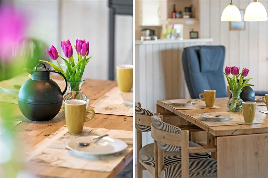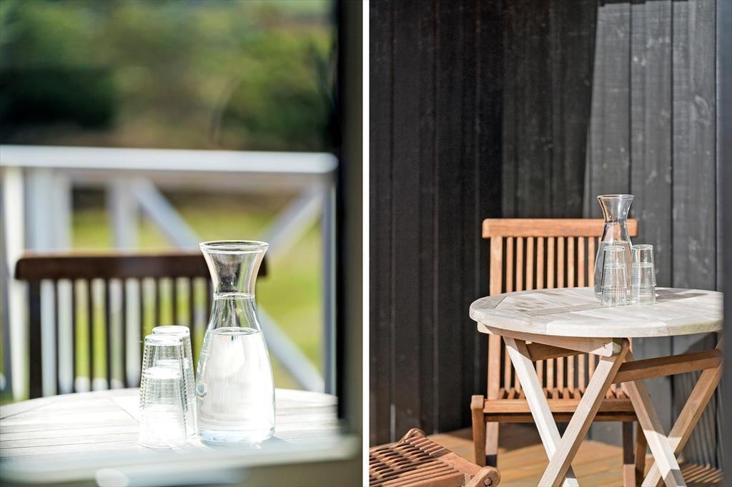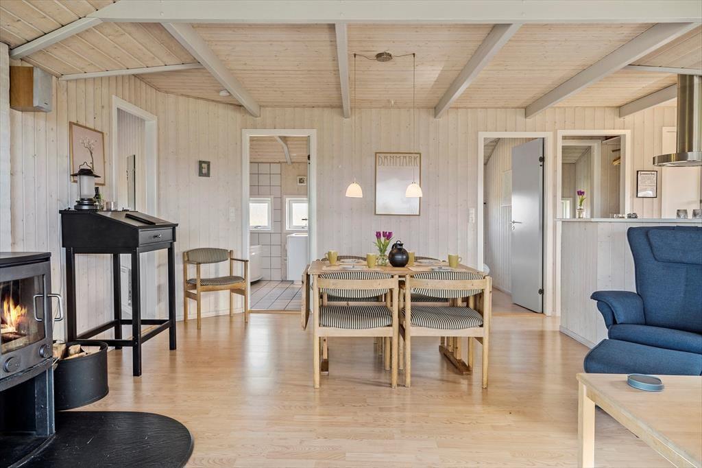Når du træder indenfor i det lyse og moderne sommerhus, bliver du straks mødt af en afslappende stemning og en indretning, der er skabt til ferie og samvær. Her er der tænkt over detaljerne – fra de store vinduespartier, der trækker lyset ind, til den hyggelige atmosfære, som indbyder til fælles madlavning, afslappede samtaler og langsomme morgener med kaffe i hånden. Køkken og stue ligger i åben forbindelse og skaber en naturlig ramme om ferielivet, hvor nærvær og fællesskab er i fokus. Uanset om vejret viser sig fra sin bedste side, eller om vinden rusker udenfor, er her plads til at slappe af og bare være – måske med en god bog eller et spil brætspil ved spisebordet.