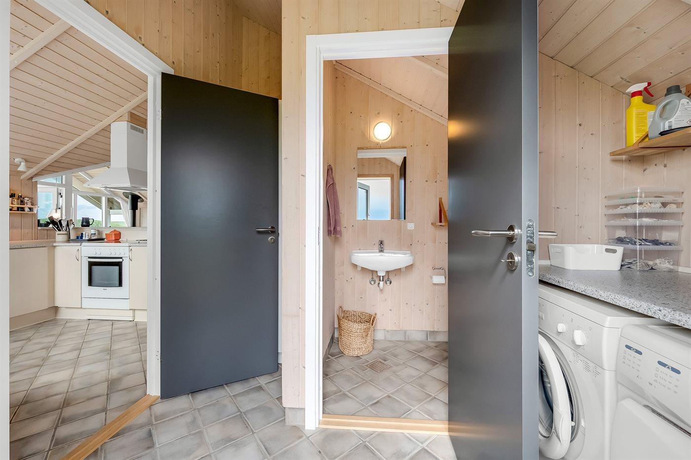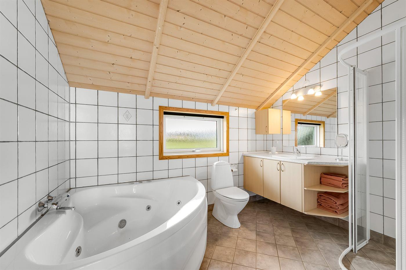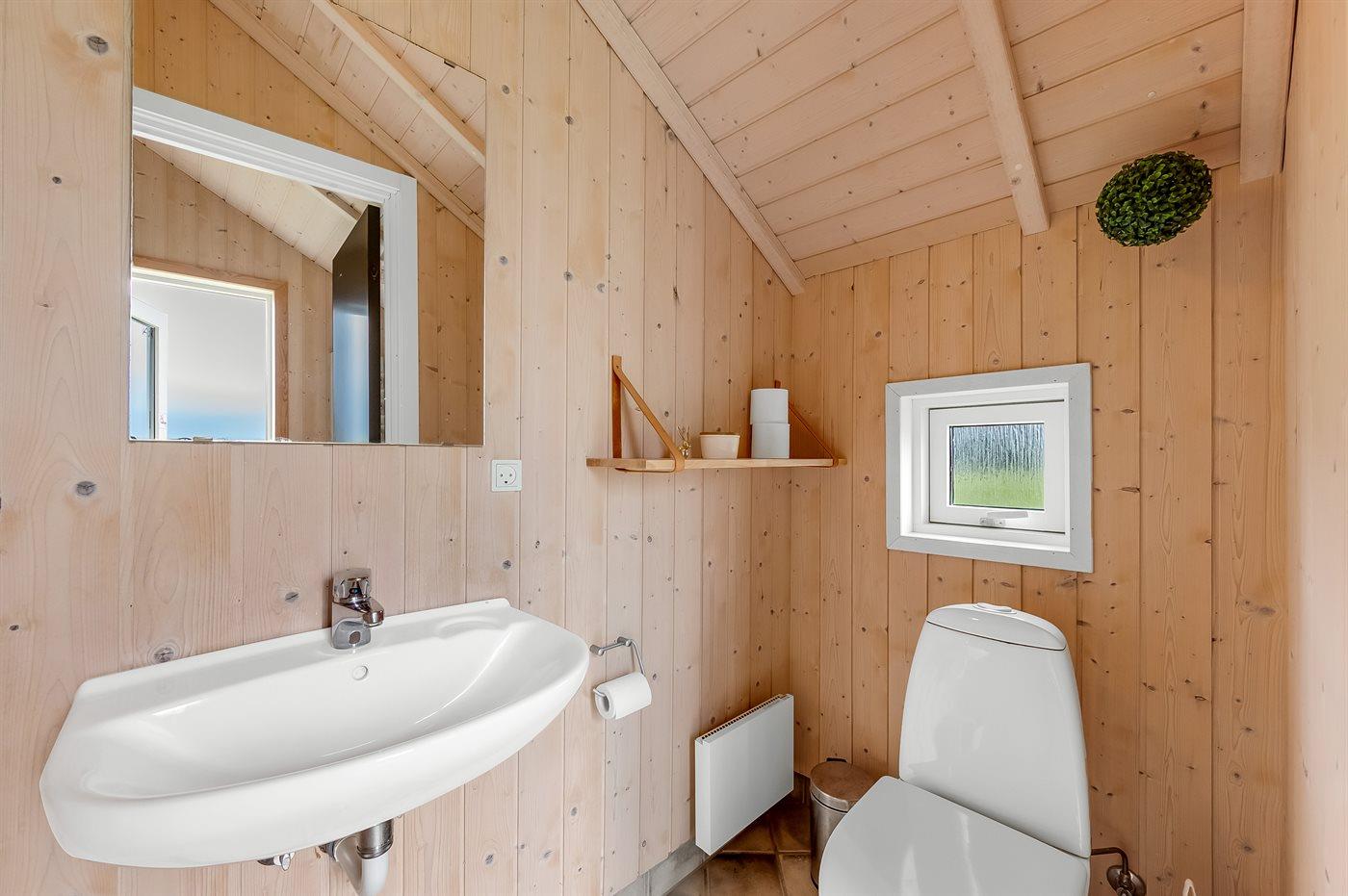 Der er 1 badeværelse med bruseniche og 2 toiletter, heraf 1 gæstetoilet. Der er gulvvarme på 1 badeværelse. Der er gulvvarme på gæstetoilettet. I saunaen er der mulighed for afslapning.