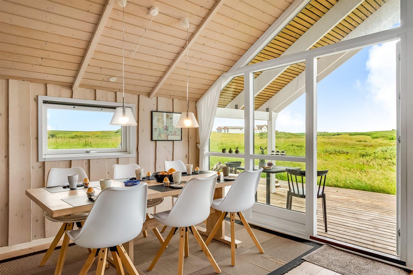 Fra den kombinerede opholds- og spisestue er der igennem husets store vinduesparti udsigt til den omkringliggende natur. Herfra er der desuden adgang til den sydvendte og delvist overdækkede terrasse, som indbyder til sommerhygge med grillmad tilberedt på husets grill.
