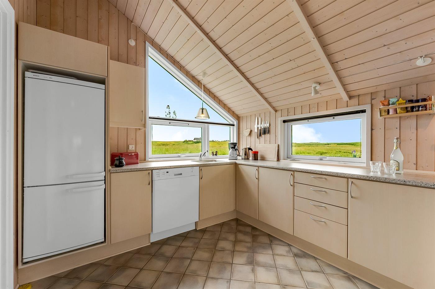 Køkkenet er udstyret med 1 køleskab. Der er 4 keramiske kogeplader, varmluftovn, mikrobølgeovn samt opvaskemaskine.