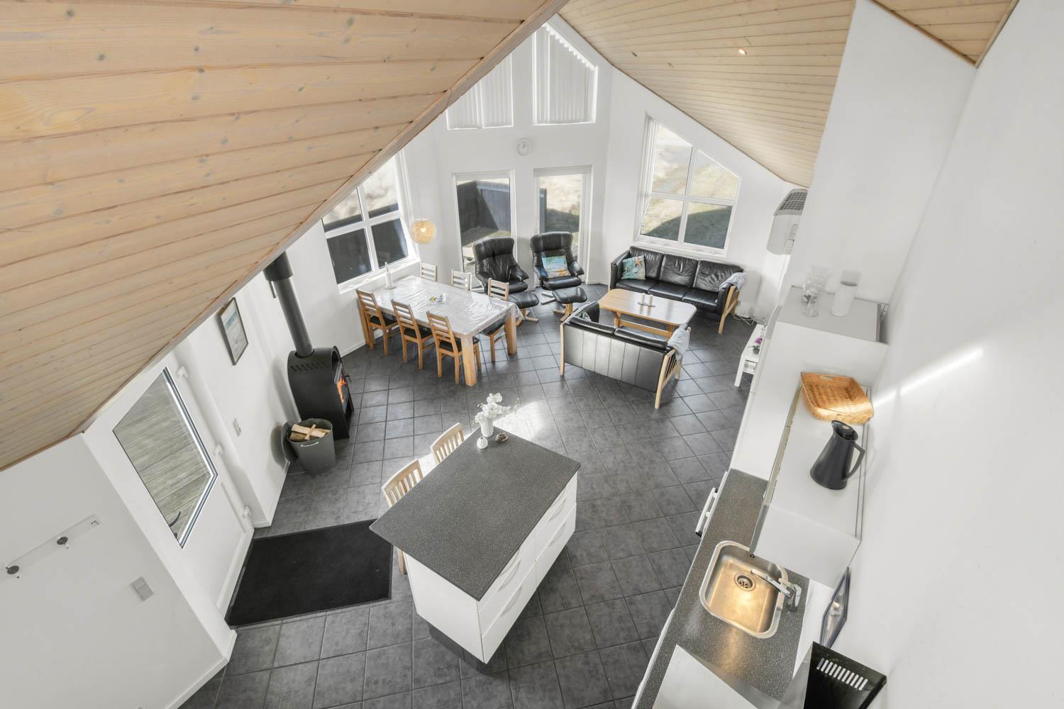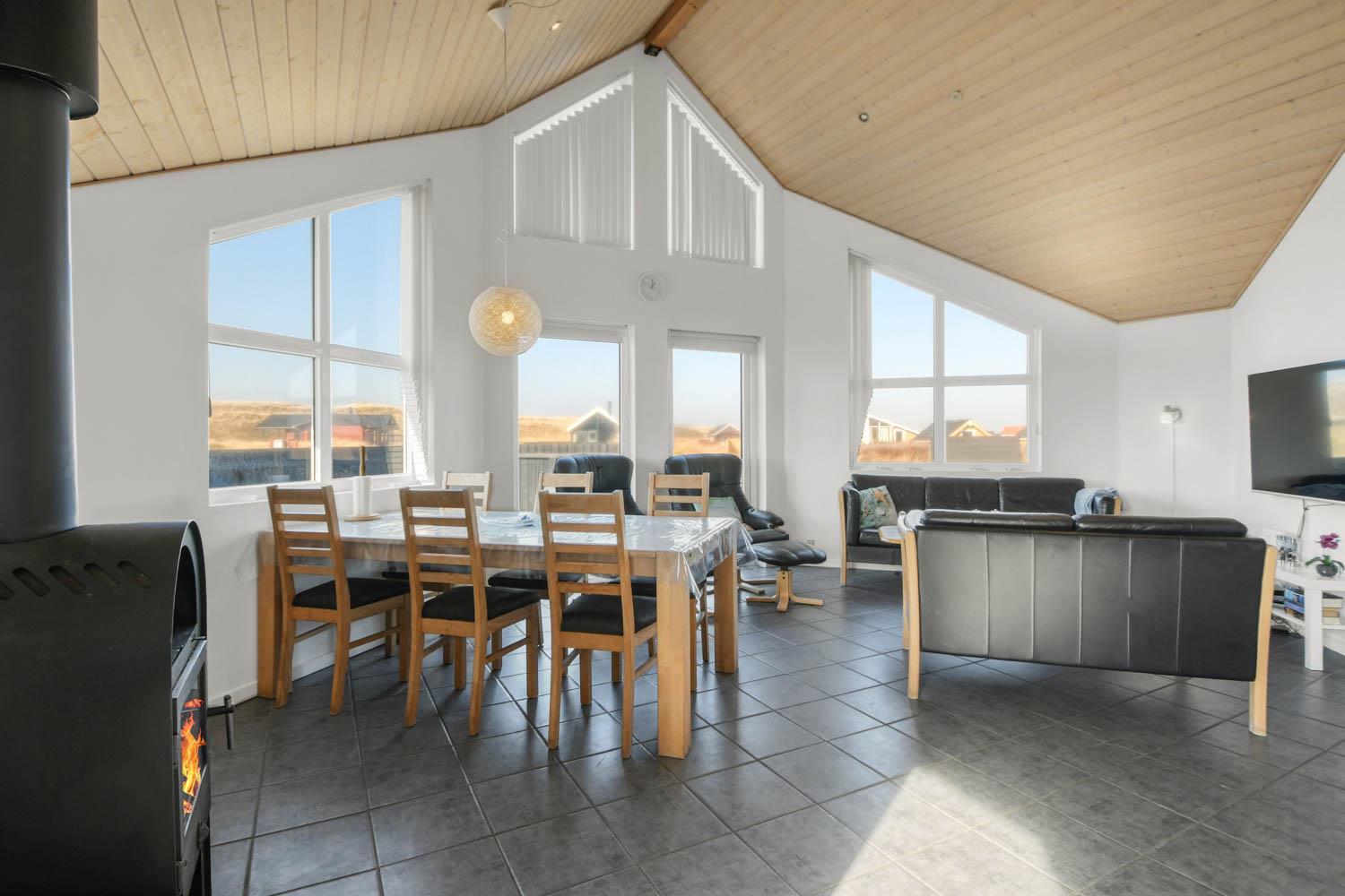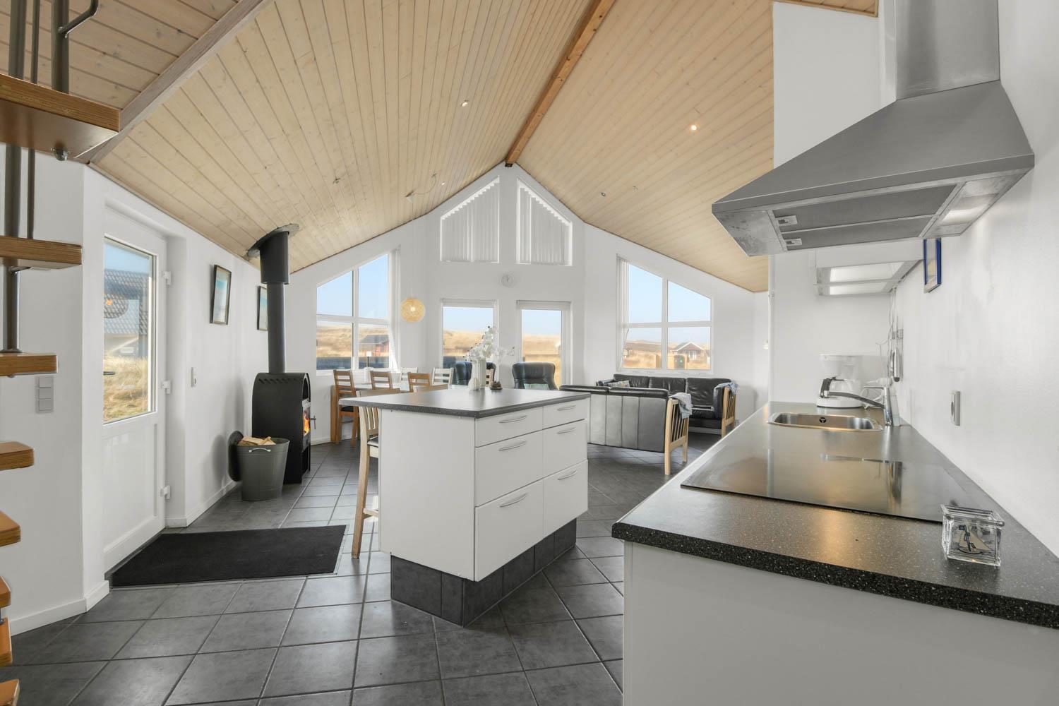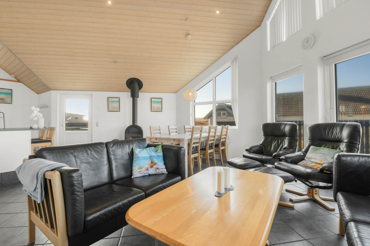 Husets stue og køkken er samlet i et stort rum. I samme rum hører faktisk også en hems med to enkeltsofaer. Køkkenet har el-komfur, køleskab med frostboks og opvaskemaskine. Stuen er indrettet med lædermøbler, brændovn, TV med danske og tyske kanaler, DVD og radio med CD afspiller. 3 soverum: 1DS + 1DS + 1KS. Hems med 2 sovemuligheder. Badeværelse: Toilet, håndvask, bruser, sauna, spa og gulvvarme. Gæstetoilet med håndvask og toilet. Køkken og stue er indrettet med klinkegulv og de store vinduespartier sørger for et godt lysindfald i rummet. Soveværelser og hems er med trægulv. Ikke rygerhus. 2 husdyr er tilladt.
