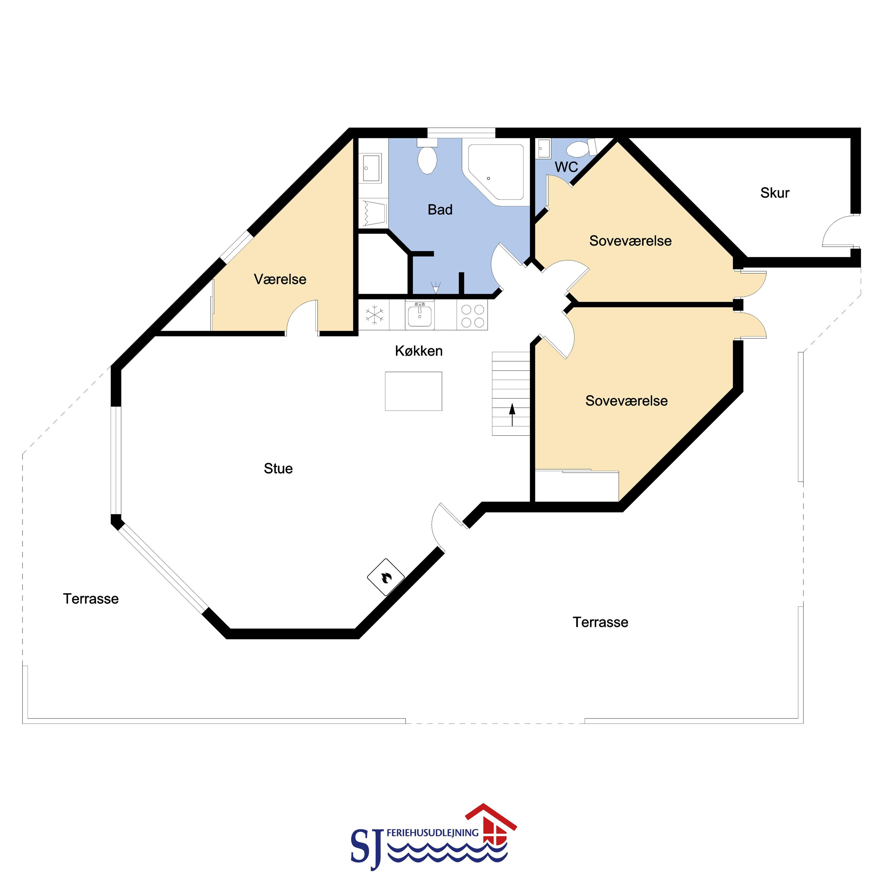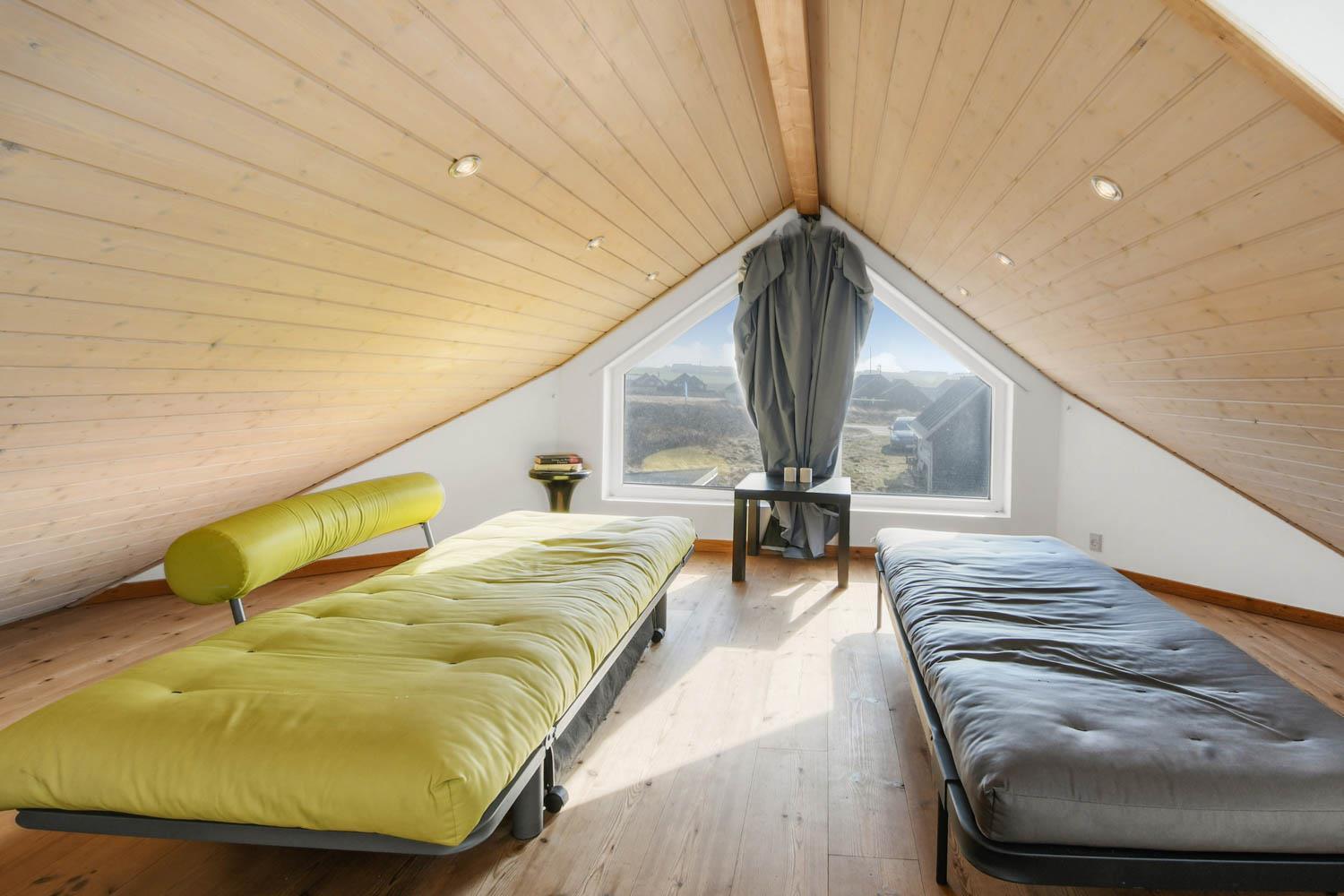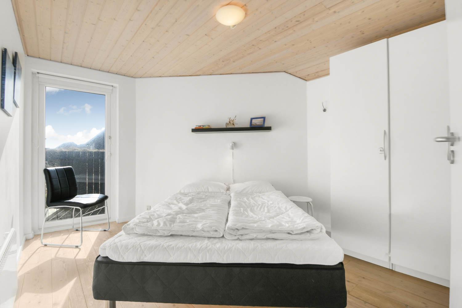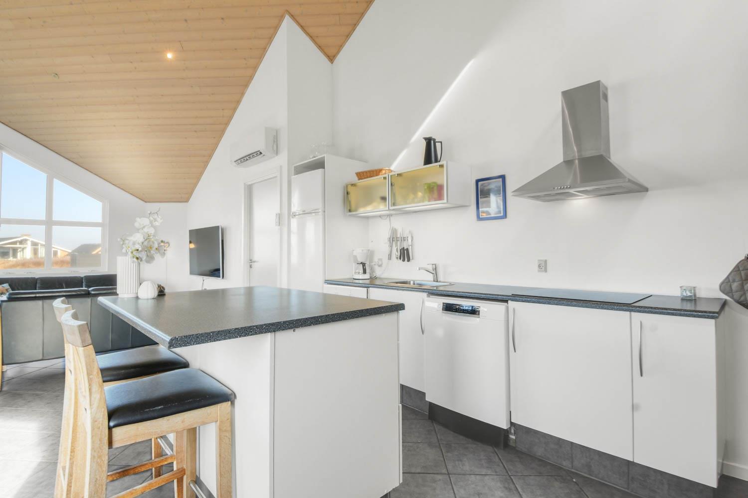 Husets stue og køkken er samlet i et stort rum. I samme rum hører faktisk også en hems med to enkeltsofaer. Køkkenet har el-komfur, køleskab med frostboks og opvaskemaskine. Stuen er indrettet med lædermøbler, brændovn, TV med danske og tyske kanaler, DVD og radio med CD afspiller. 3 soverum: 1DS + 1DS + 1KS. Hems med 2 sovemuligheder. Badeværelse: Toilet, håndvask, bruser, sauna, spa og gulvvarme. Gæstetoilet med håndvask og toilet. Køkken og stue er indrettet med klinkegulv og de store vinduespartier sørger for et godt lysindfald i rummet. Soveværelser og hems er med trægulv. Ikke rygerhus. 2 husdyr er tilladt.
