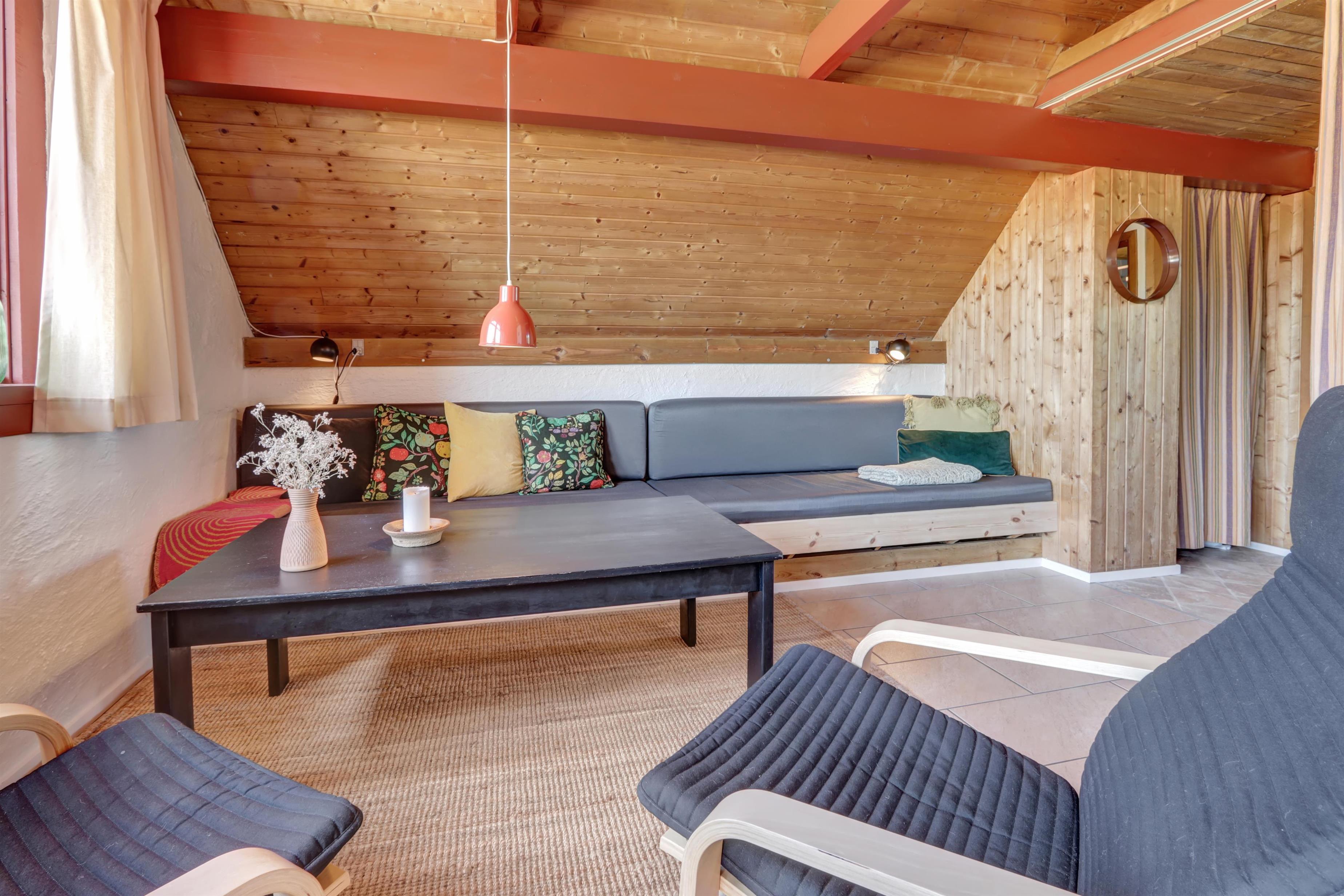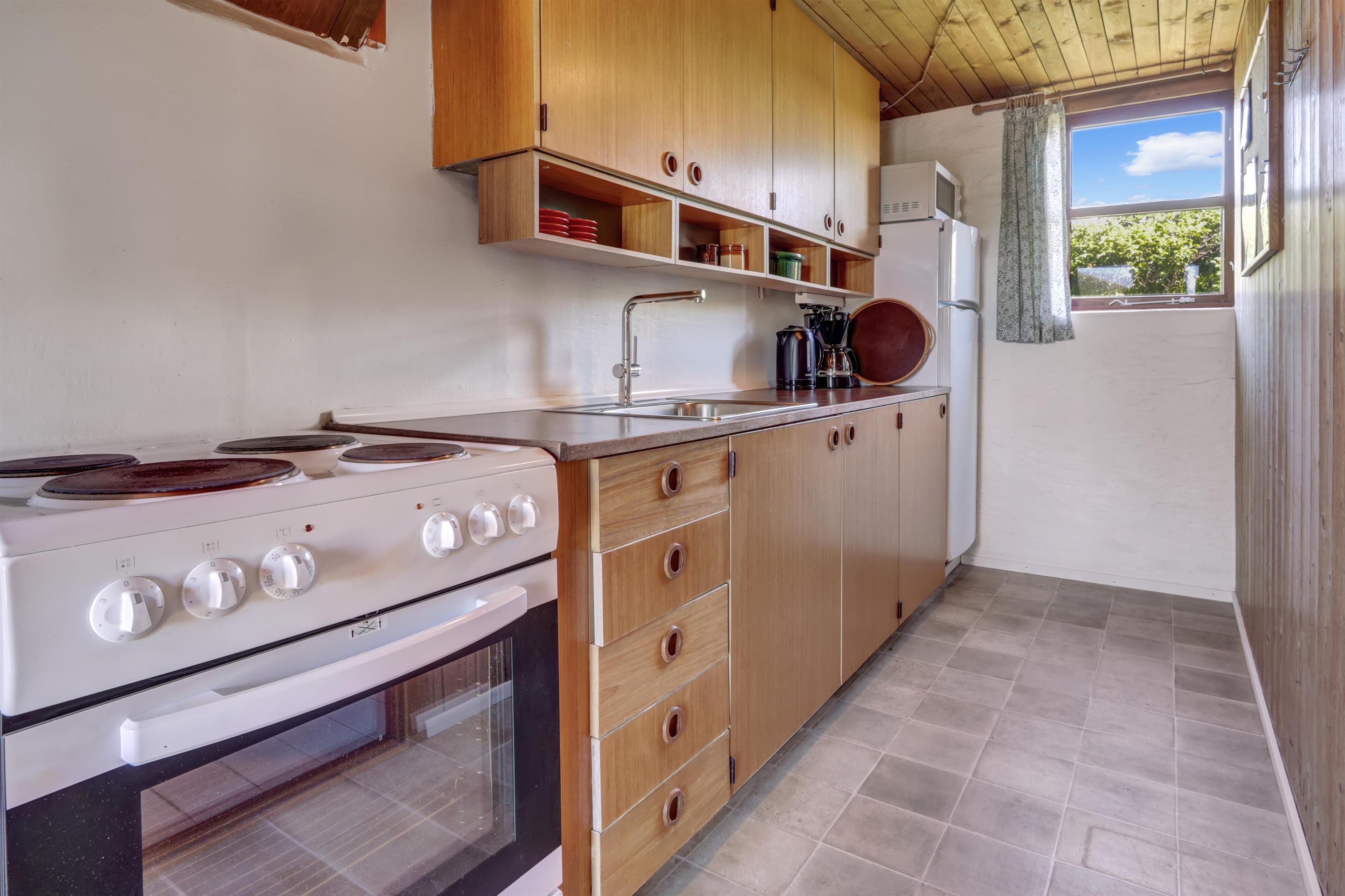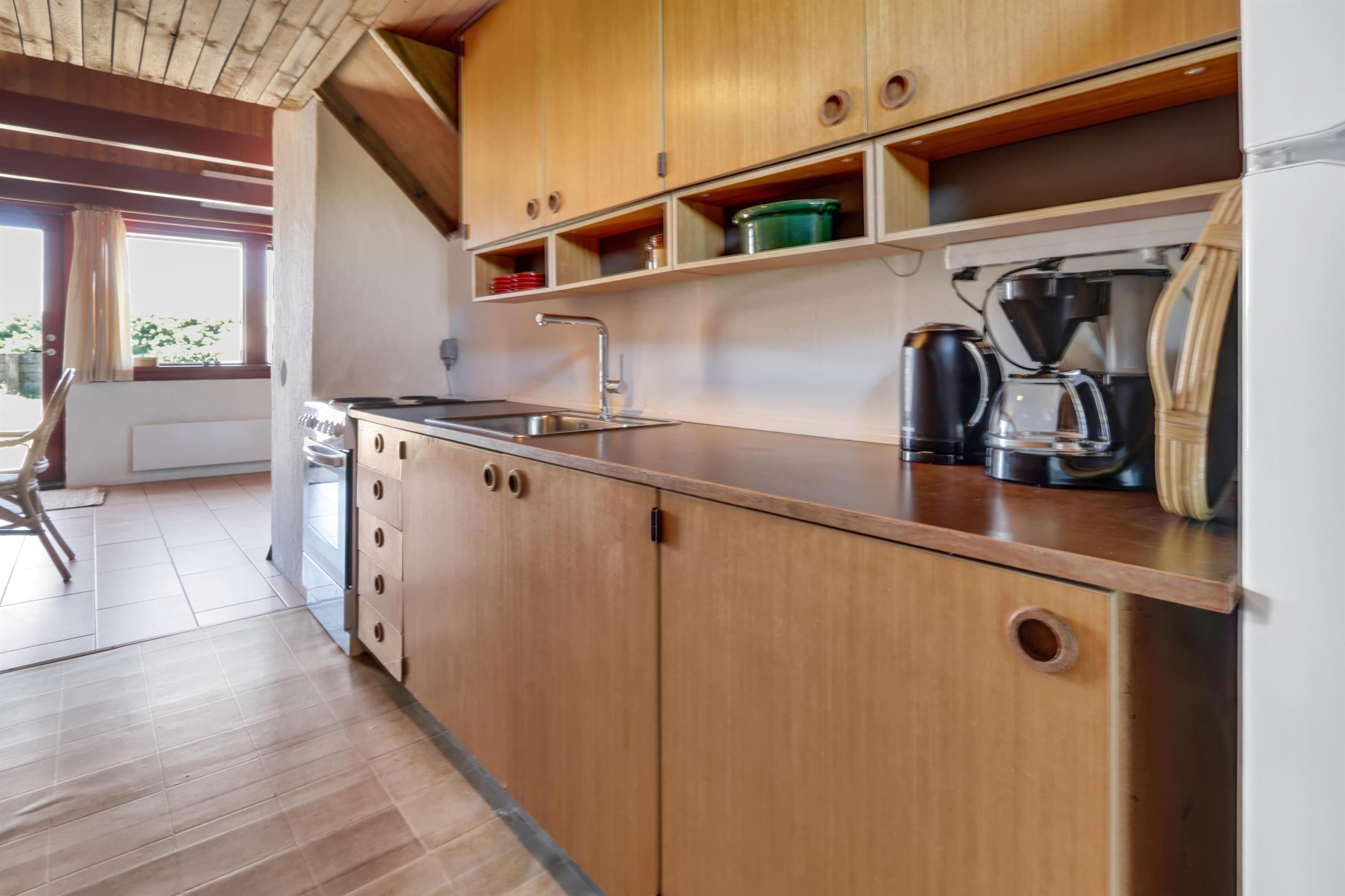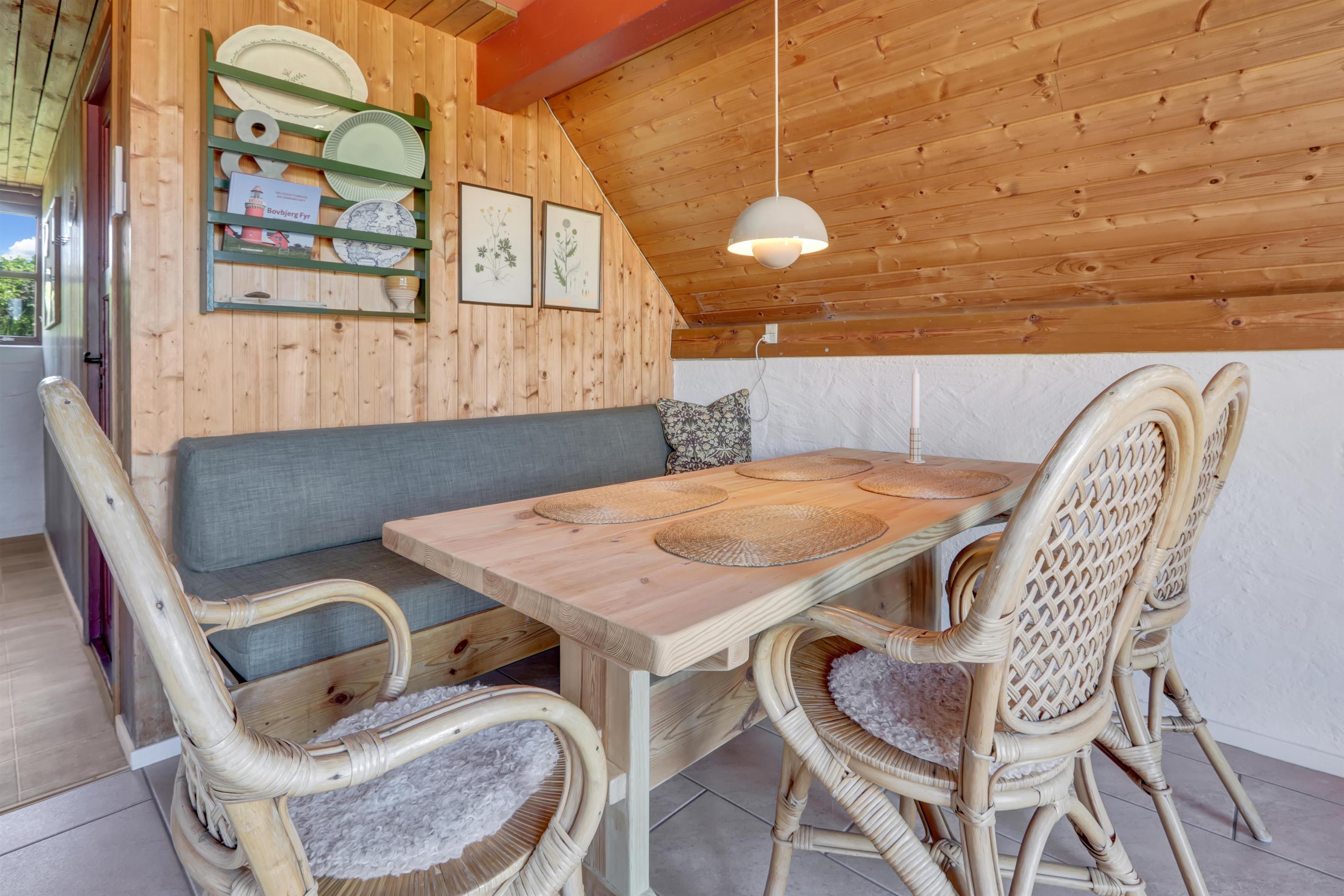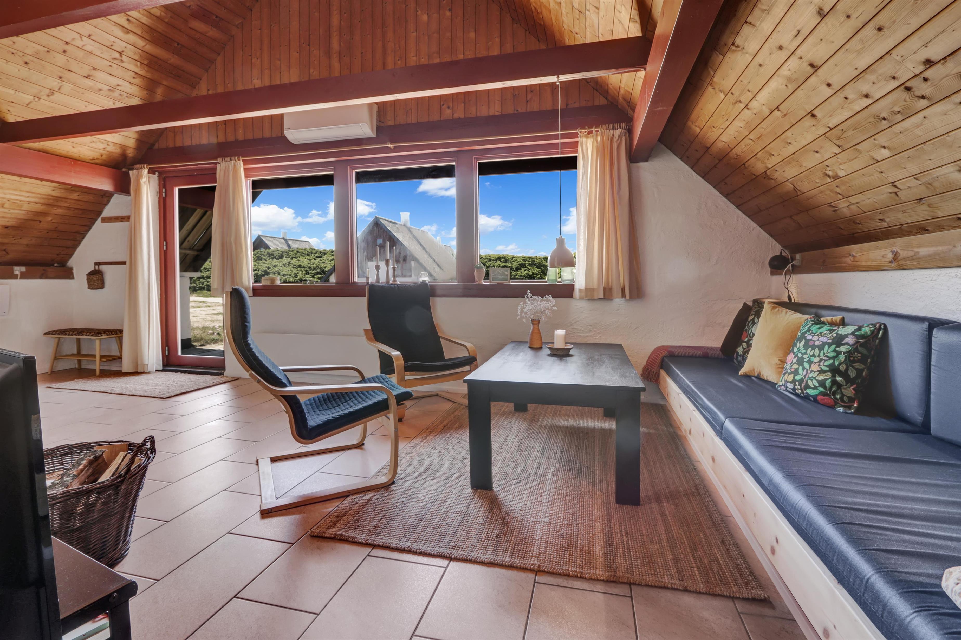 Fra opholdsstuen er der udgang til en lille, overdækket terrasse med havemøbler, 2 solvogne og grill. Huset er en del af Fjaltring Ferieby som består af 25 næsten identiske A-huse fordelt i 5 cirkler. Hele Feriebyen ligge i en dejlig ”gryde” i det fredede klitlandskab kun ca. 200m fra Vesterhavet. Ved fælleshuset er der el-bil-oplader til rådighed. Nyd en økonomisk ferie i et enkelt feriehus med en helt unik beliggenhed. Parker bilen og nyd at I resten af ferien kan gå til stranden på under 5 minutter. Oplev det brusende Vesterhav som hverdag byder på nye oplevelser. Gå en tur eller dyrk den daglige motion langs med havet, i det smukke landskab eller udforsk områdets mange andre muligheder.