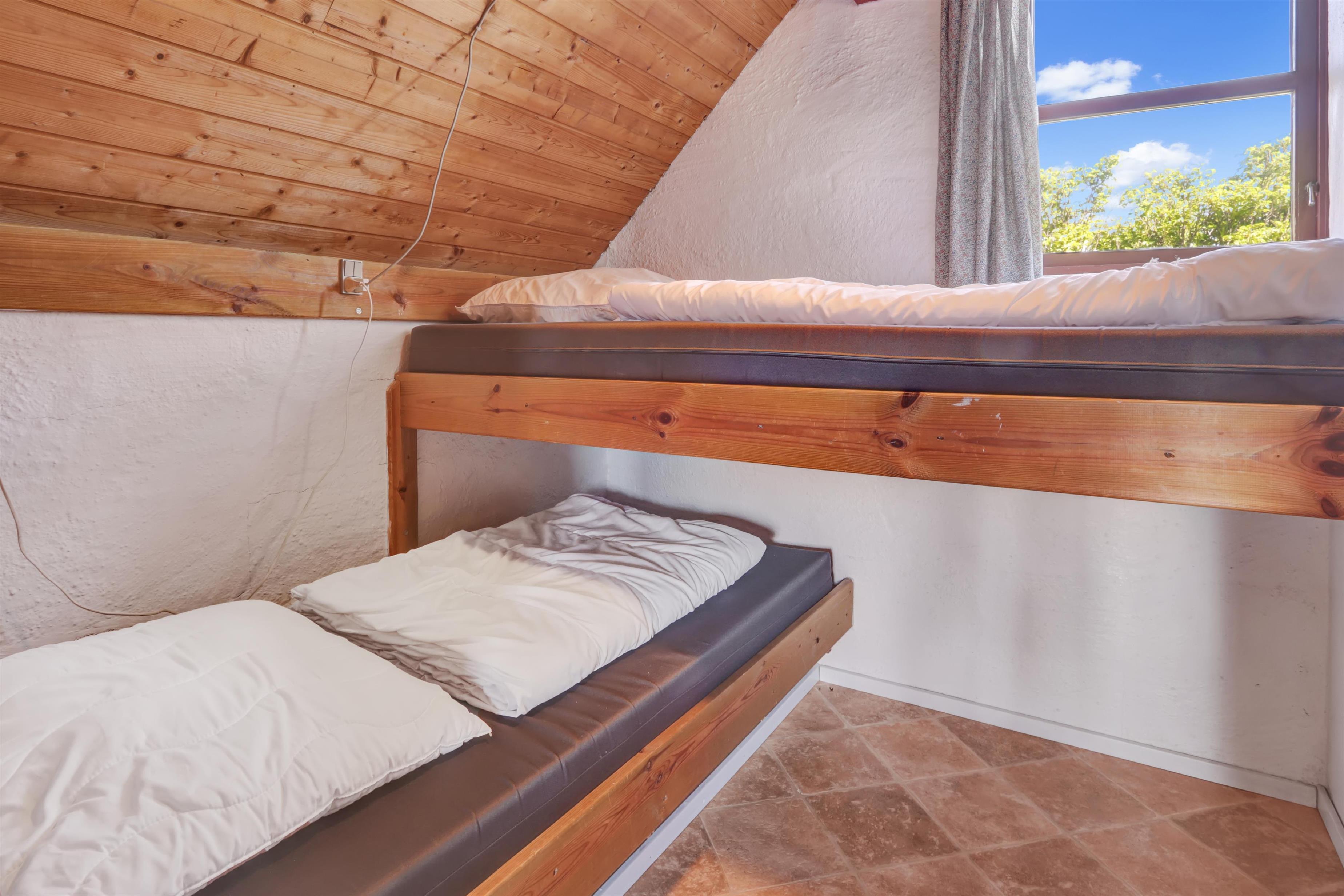 Rustikt sommerhus på 90 m2 med 2 soverum (1DS, 4ES). Soverum med 1 DS er på 1. sal. 2 ES i vinkel i værelse i stueplan og 2ES i opholdsstuen. Huset er enkelt indrettet med en opholdsstue med polstermøbler, TV med danske og tyske programmer og pejs. Enkelt køkkenhjørne med elektrisk komfur med 4 kogeplader samt køleskab. Badeværelse med toilet, håndvask og bruser. Husdyr ikke tilladt. Ikke rygerhus.