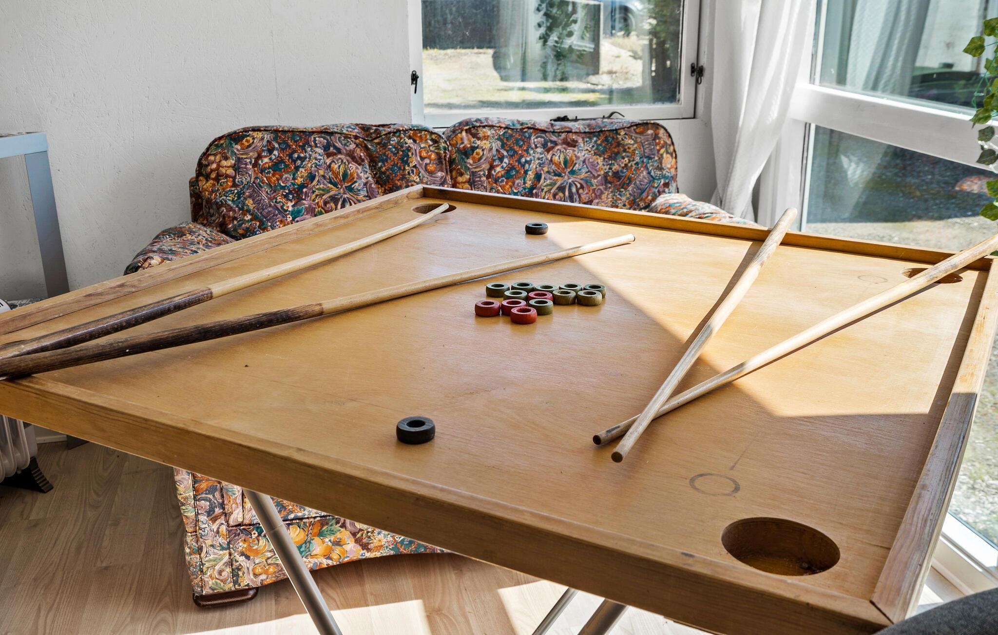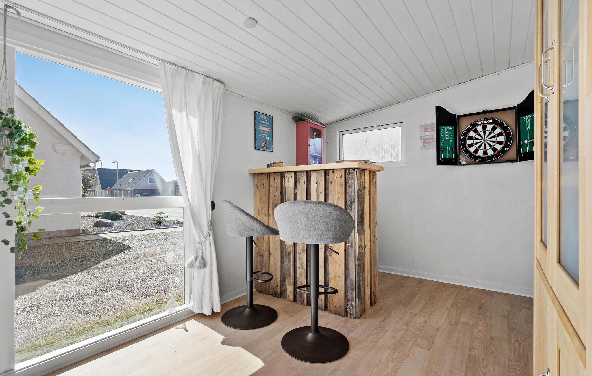 I jeres feriehus i Bøvlingbjerg venter der jer en stilfuldt indrettet stue med en behagelig sofa samt et rustikt trædesign og murstenselementer, der skaber en ægte hyggeatmosfære. Benyt jer af det hyggelige rum til at læse en god bog eller spille sjove brætspil. Saml jer til fælles måltider i den moderne spisestue. For underholdning er der et separat rum med dartskive og en lille bar, hvor I kan tilbringe jeres aftener med et lille turneringsspil.