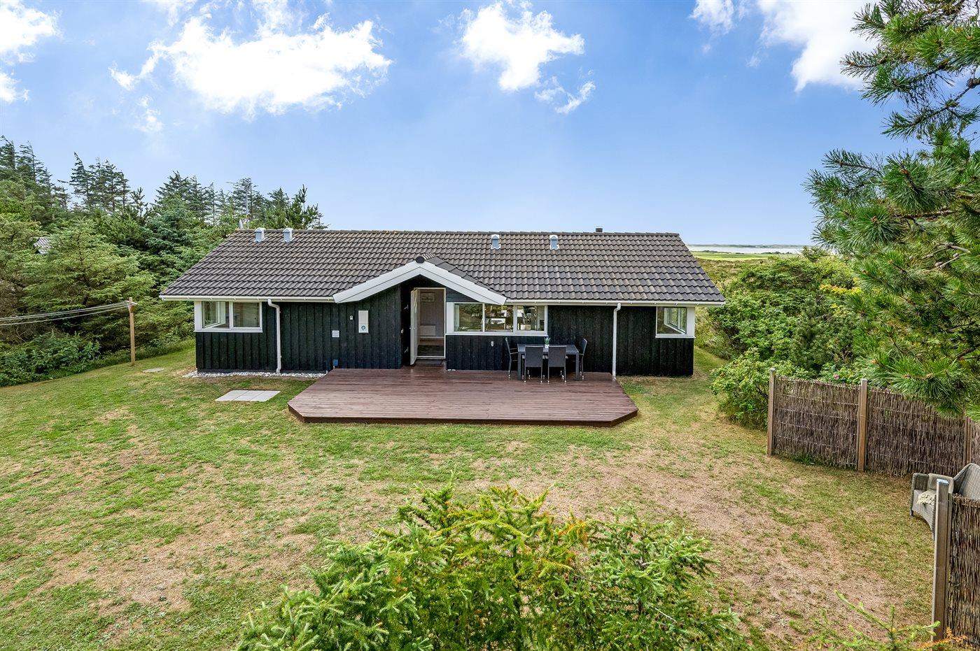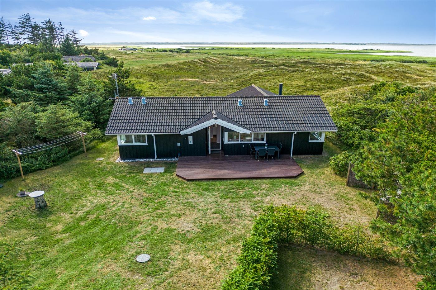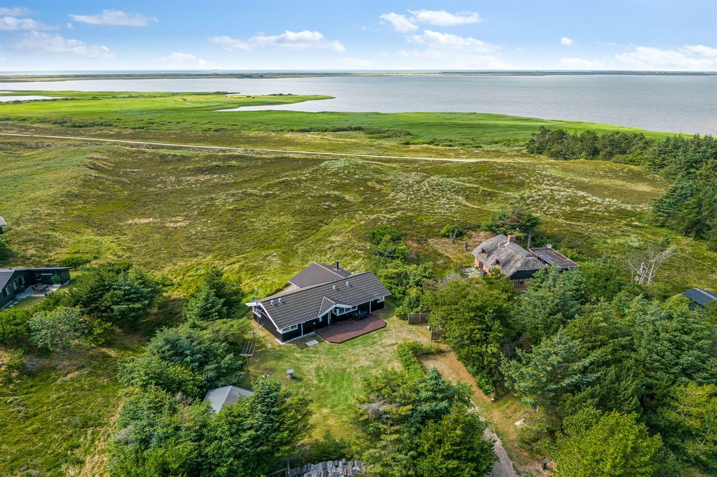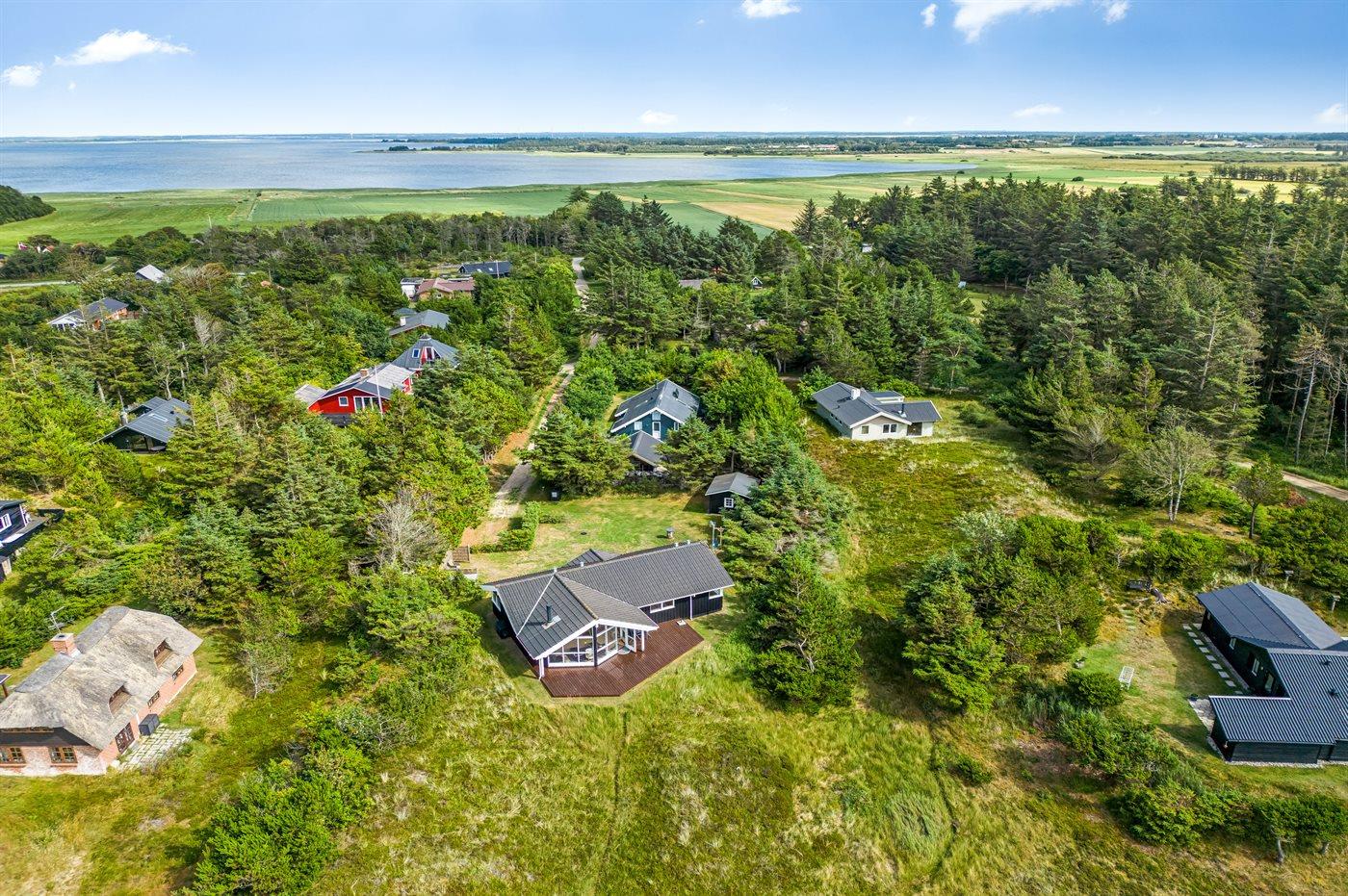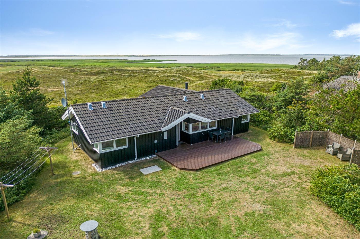 Et rigtig dejligt sommerhus i træ, bygget i 2003, beliggende på en natur-/klitgrund. Huset ligger for enden af en vej og fra stuen er der en flot udsigt over fjorden og klitområdet. Til huset hører et dejligt terrasseareal med havemøbler. Huset er flot indrettet med nye møbler. Vægge og lofter er beklædt med træ. Trægulve, dog opvarmet klinkegulv i badeværelse og køkken. Pænt badeværelse med bruseniche, 2-pers. spa samt direkte adgang til husets sauna. Det flotte køkken indeholder bl.a. opvaskemaskine, mikrobølgeovn samt komfur med keramiske kogeplader og varmluftovn. Opholdsstuen er indrettet med brændeovn, Radio, TV med parabol (digital) og DVD-afspiller. De 6 sovepladser fordeler sig på 3 værelser: 2 med dobbeltseng og 1 med 2 enkeltsenge. Endvidere står vaskemaskine, tørretumbler og høj barnestol.