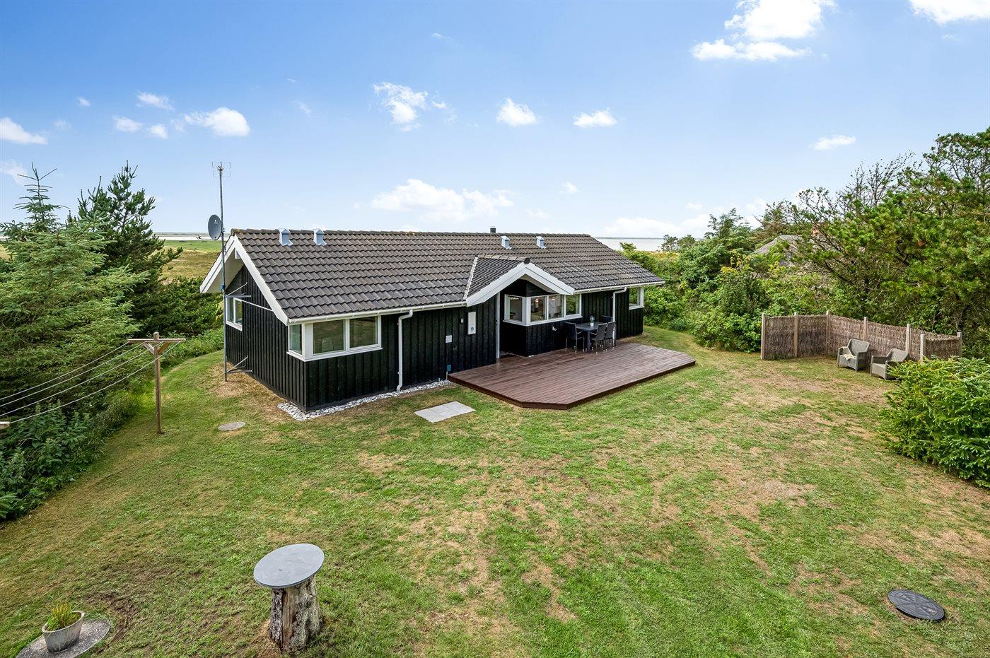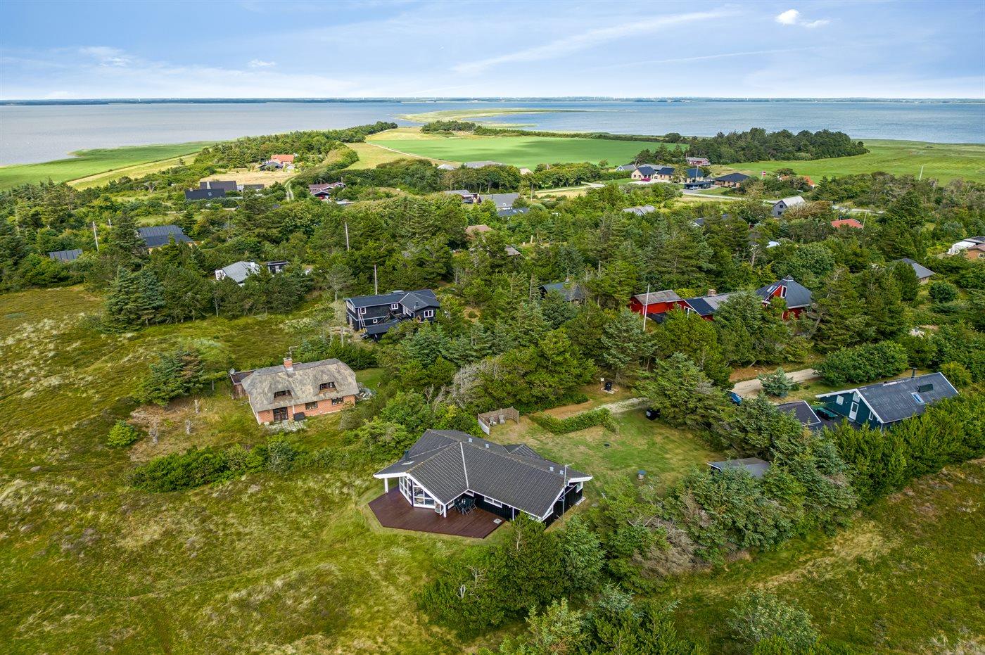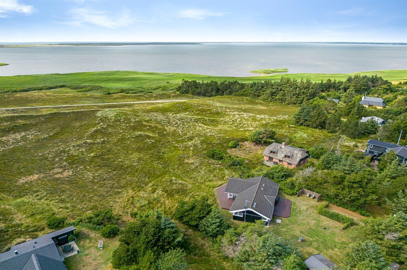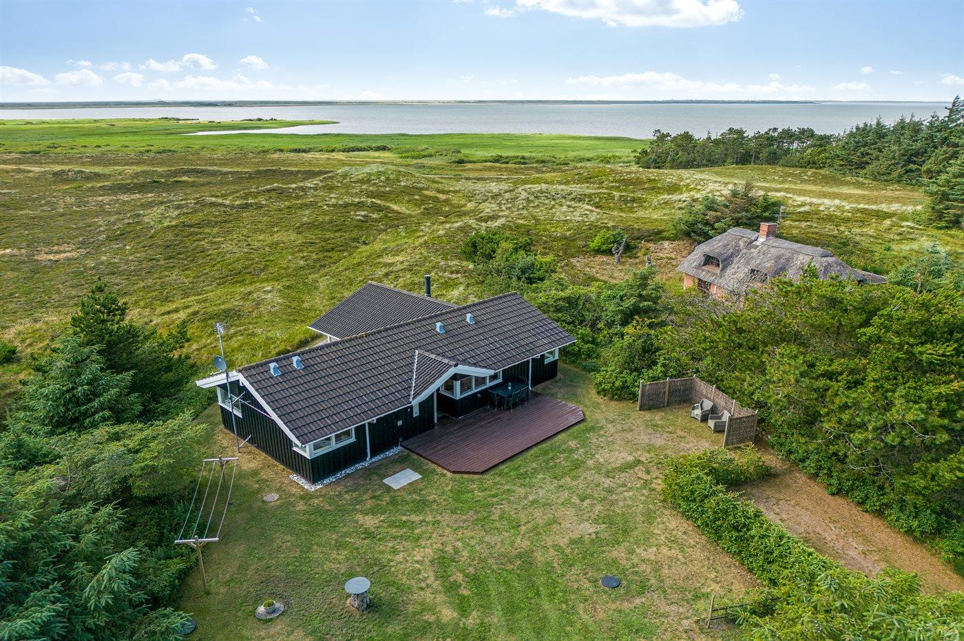 Et rigtig dejligt sommerhus i træ, bygget i 2003, beliggende på en natur-/klitgrund. Huset ligger for enden af en vej og fra stuen er der en flot udsigt over fjorden og klitområdet. Til huset hører et dejligt terrasseareal med havemøbler. Huset er flot indrettet med nye møbler. Vægge og lofter er beklædt med træ. Trægulve, dog opvarmet klinkegulv i badeværelse og køkken. Pænt badeværelse med bruseniche, 2-pers. spa samt direkte adgang til husets sauna. Det flotte køkken indeholder bl.a. opvaskemaskine, mikrobølgeovn samt komfur med keramiske kogeplader og varmluftovn. Opholdsstuen er indrettet med brændeovn, Radio, TV med parabol (digital) og DVD-afspiller. De 6 sovepladser fordeler sig på 3 værelser: 2 med dobbeltseng og 1 med 2 enkeltsenge. Endvidere står vaskemaskine, tørretumbler og høj barnestol.