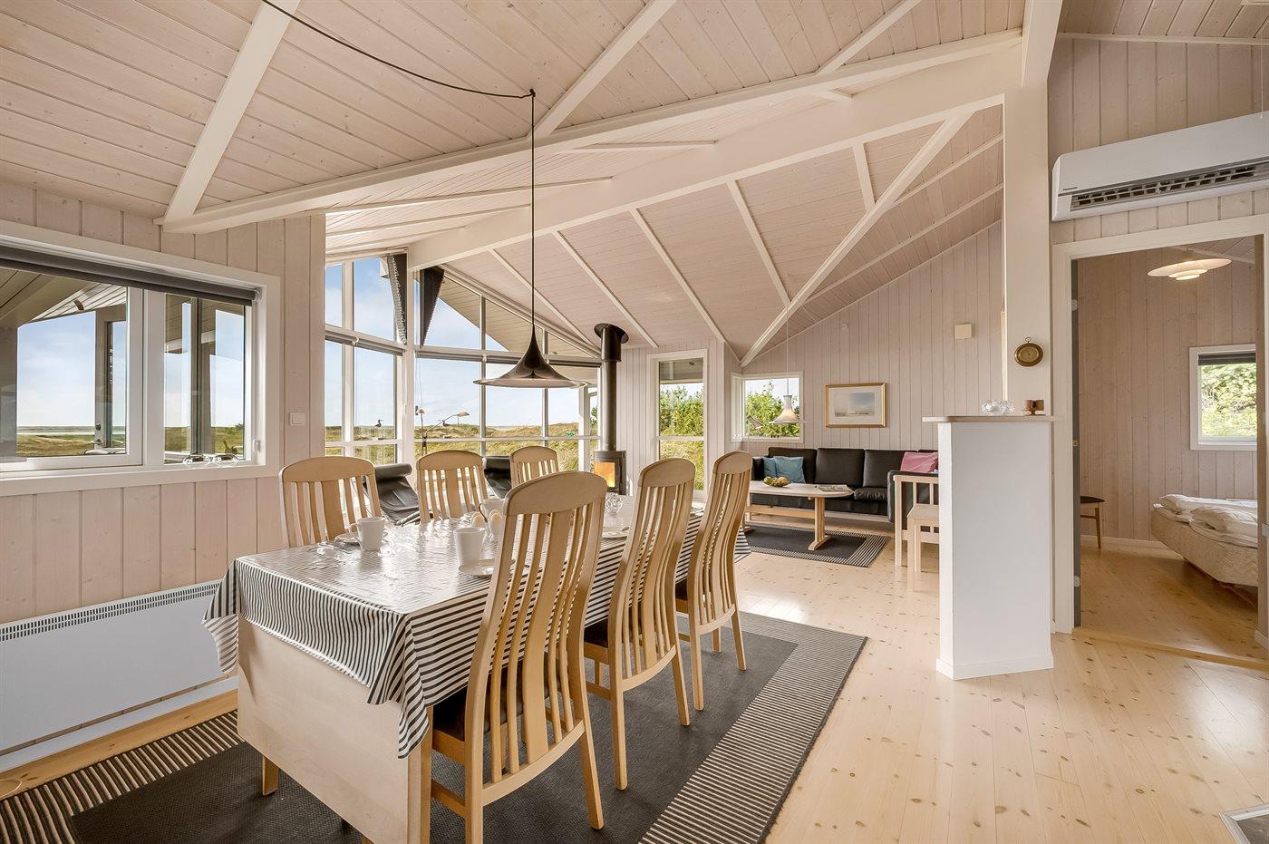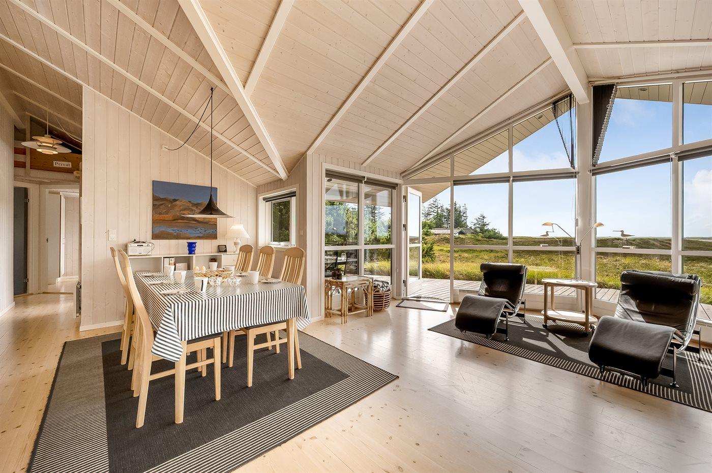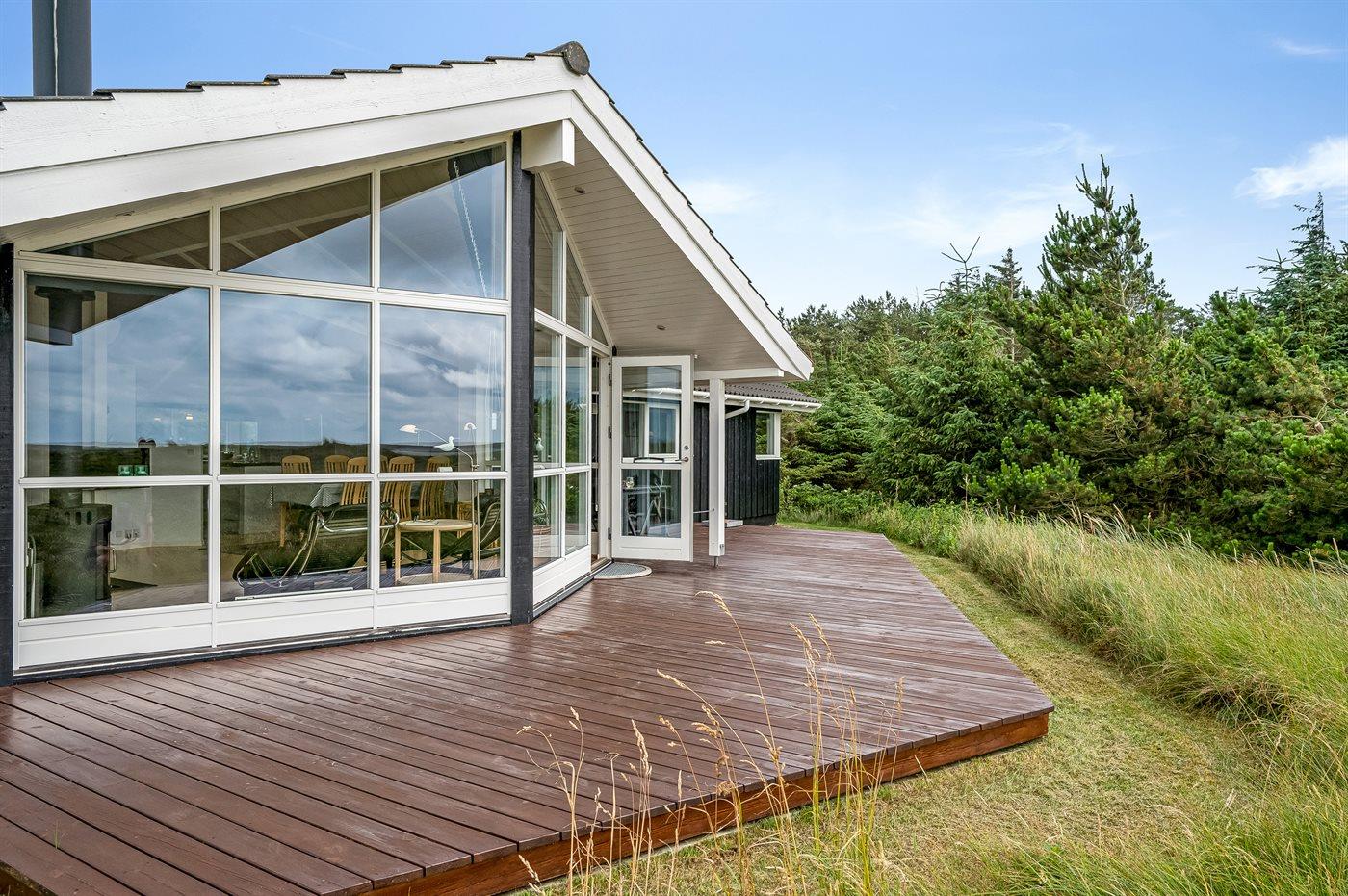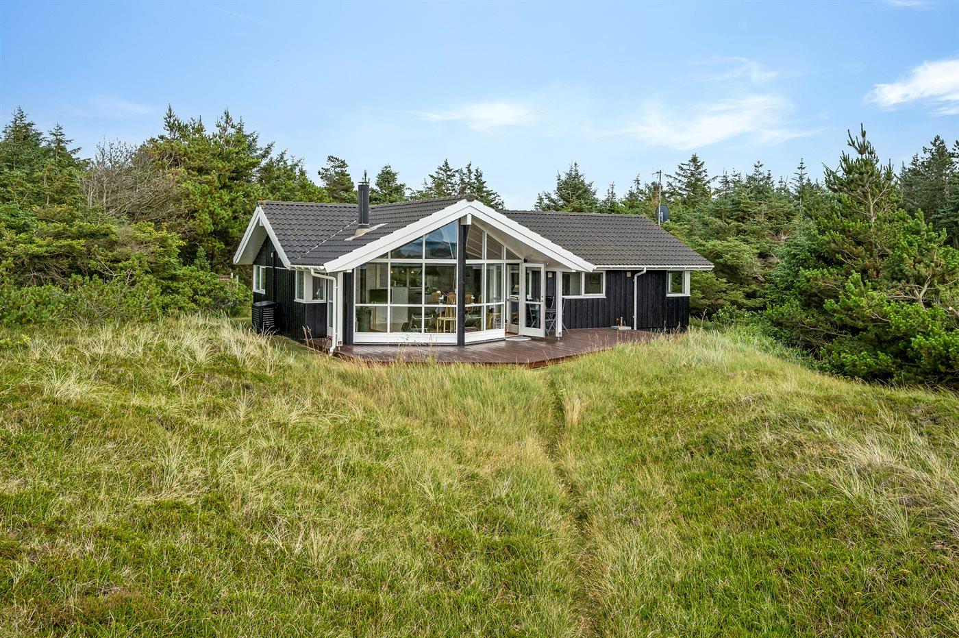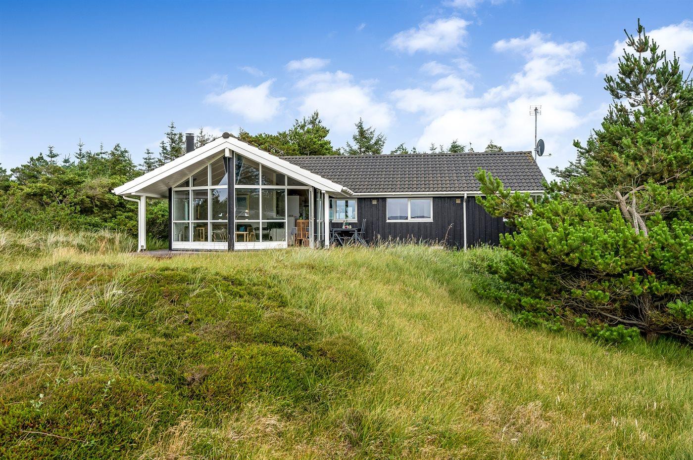 Et rigtig dejligt sommerhus i træ, bygget i 2003, beliggende på en natur-/klitgrund. Huset ligger for enden af en vej og fra stuen er der en flot udsigt over fjorden og klitområdet. Til huset hører et dejligt terrasseareal med havemøbler. Huset er flot indrettet med nye møbler. Vægge og lofter er beklædt med træ. Trægulve, dog opvarmet klinkegulv i badeværelse og køkken. Pænt badeværelse med bruseniche, 2-pers. spa samt direkte adgang til husets sauna. Det flotte køkken indeholder bl.a. opvaskemaskine, mikrobølgeovn samt komfur med keramiske kogeplader og varmluftovn. Opholdsstuen er indrettet med brændeovn, Radio, TV med parabol (digital) og DVD-afspiller. De 6 sovepladser fordeler sig på 3 værelser: 2 med dobbeltseng og 1 med 2 enkeltsenge. Endvidere står vaskemaskine, tørretumbler og høj barnestol.