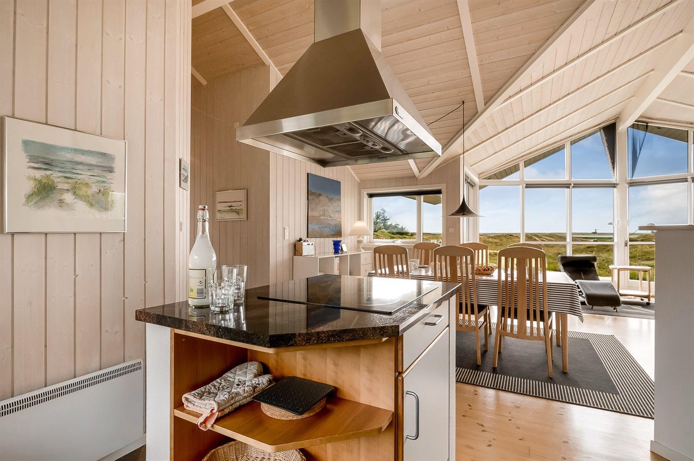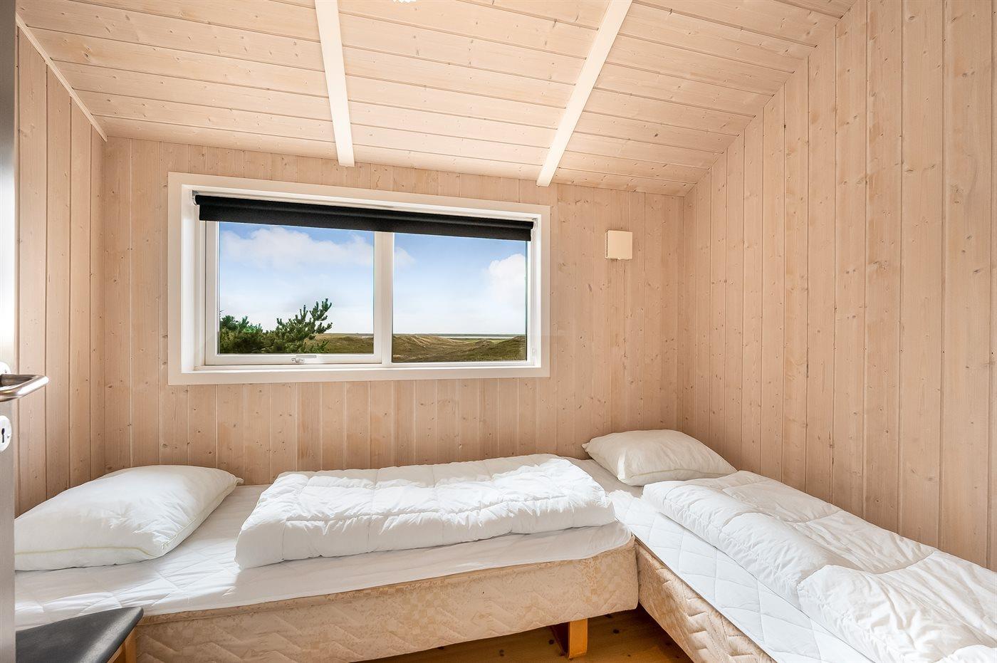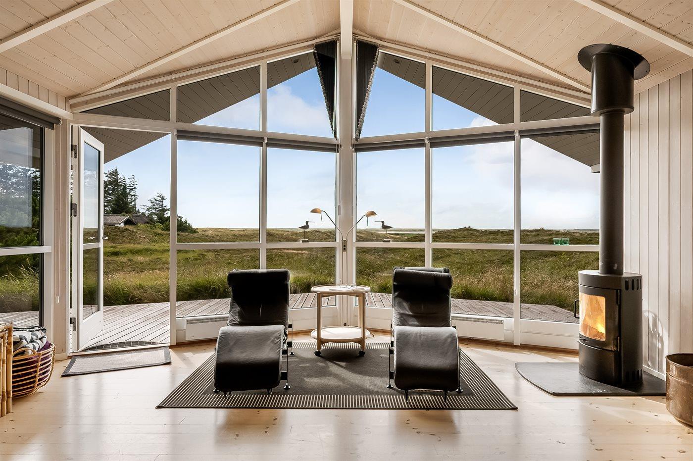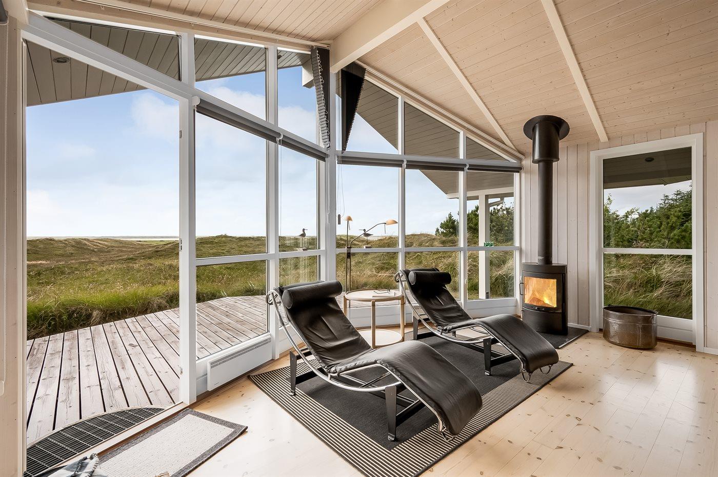 Et rigtig dejligt sommerhus i træ, bygget i 2003, beliggende på en natur-/klitgrund. Huset ligger for enden af en vej og fra stuen er der en flot udsigt over fjorden og klitområdet. Til huset hører et dejligt terrasseareal med havemøbler. Huset er flot indrettet med nye møbler. Vægge og lofter er beklædt med træ. Trægulve, dog opvarmet klinkegulv i badeværelse og køkken. Pænt badeværelse med bruseniche, 2-pers. spa samt direkte adgang til husets sauna. Det flotte køkken indeholder bl.a. opvaskemaskine, mikrobølgeovn samt komfur med keramiske kogeplader og varmluftovn. Opholdsstuen er indrettet med brændeovn, Radio, TV med parabol (digital) og DVD-afspiller. De 6 sovepladser fordeler sig på 3 værelser: 2 med dobbeltseng og 1 med 2 enkeltsenge. Endvidere står vaskemaskine, tørretumbler og høj barnestol.