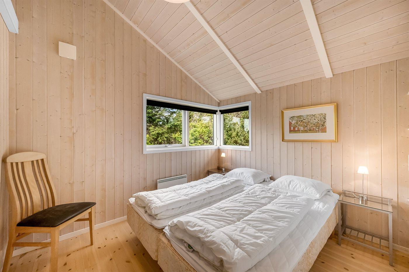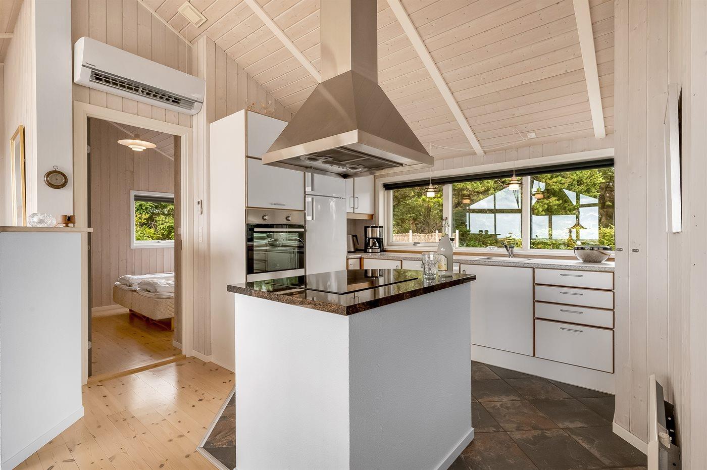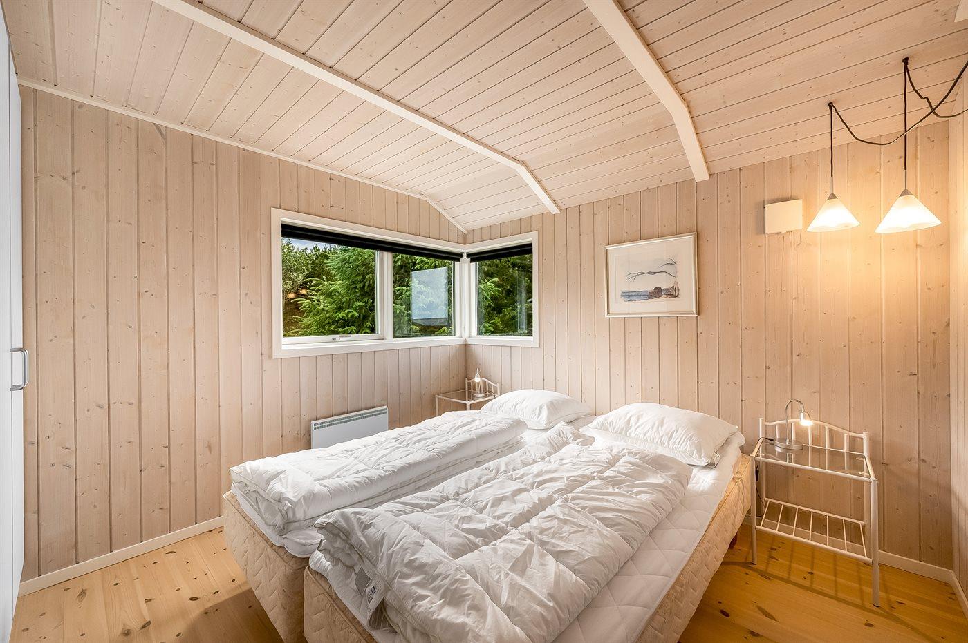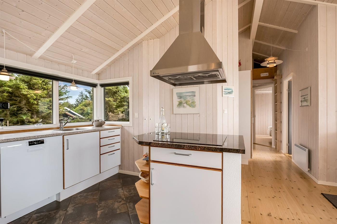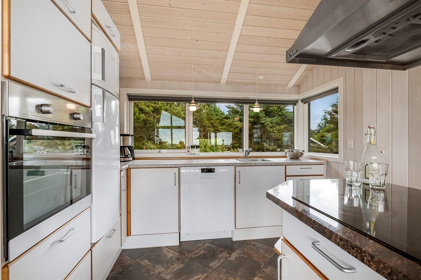 Et rigtig dejligt sommerhus i træ, bygget i 2003, beliggende på en natur-/klitgrund. Huset ligger for enden af en vej og fra stuen er der en flot udsigt over fjorden og klitområdet. Til huset hører et dejligt terrasseareal med havemøbler. Huset er flot indrettet med nye møbler. Vægge og lofter er beklædt med træ. Trægulve, dog opvarmet klinkegulv i badeværelse og køkken. Pænt badeværelse med bruseniche, 2-pers. spa samt direkte adgang til husets sauna. Det flotte køkken indeholder bl.a. opvaskemaskine, mikrobølgeovn samt komfur med keramiske kogeplader og varmluftovn. Opholdsstuen er indrettet med brændeovn, Radio, TV med parabol (digital) og DVD-afspiller. De 6 sovepladser fordeler sig på 3 værelser: 2 med dobbeltseng og 1 med 2 enkeltsenge. Endvidere står vaskemaskine, tørretumbler og høj barnestol.