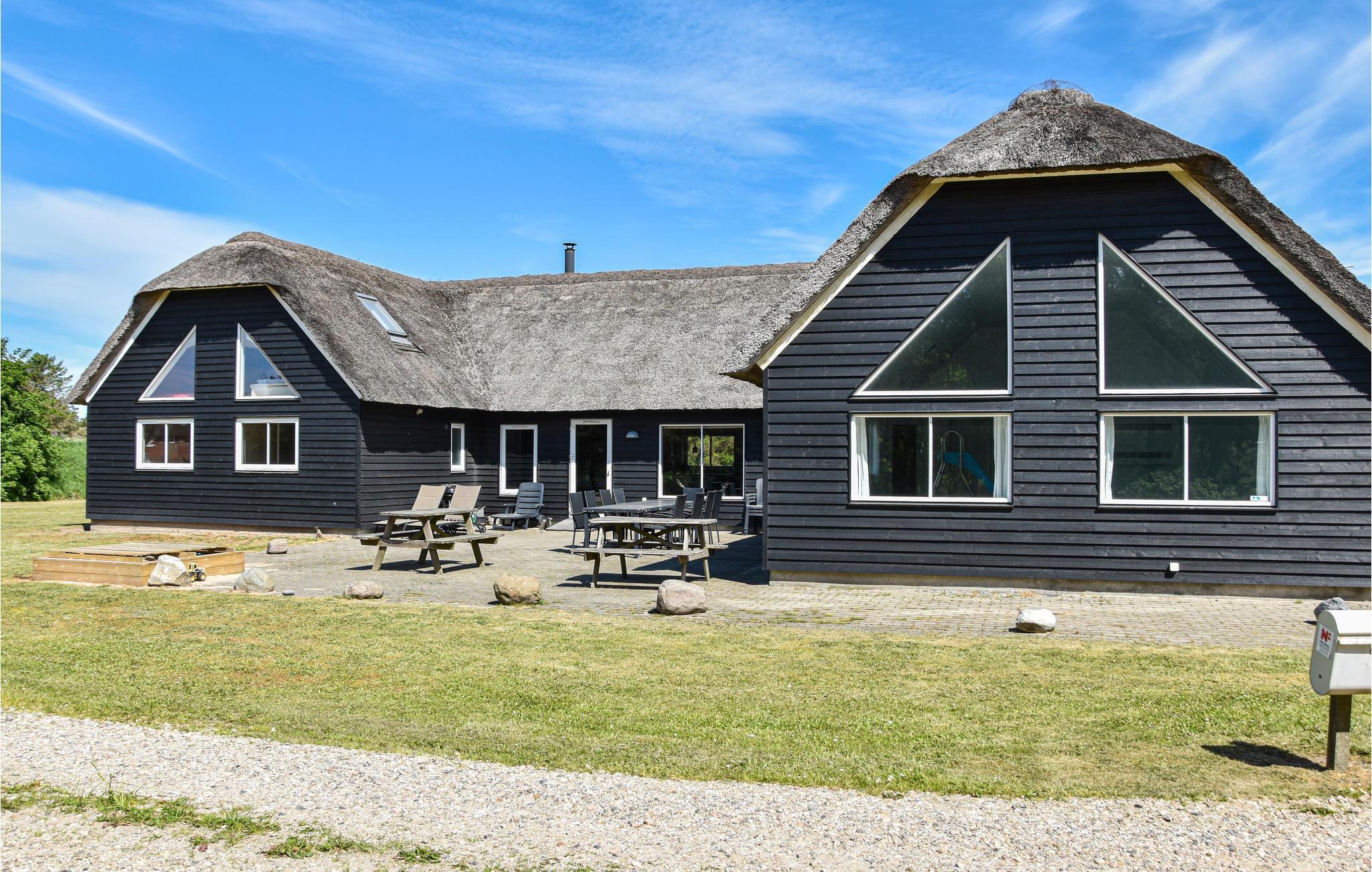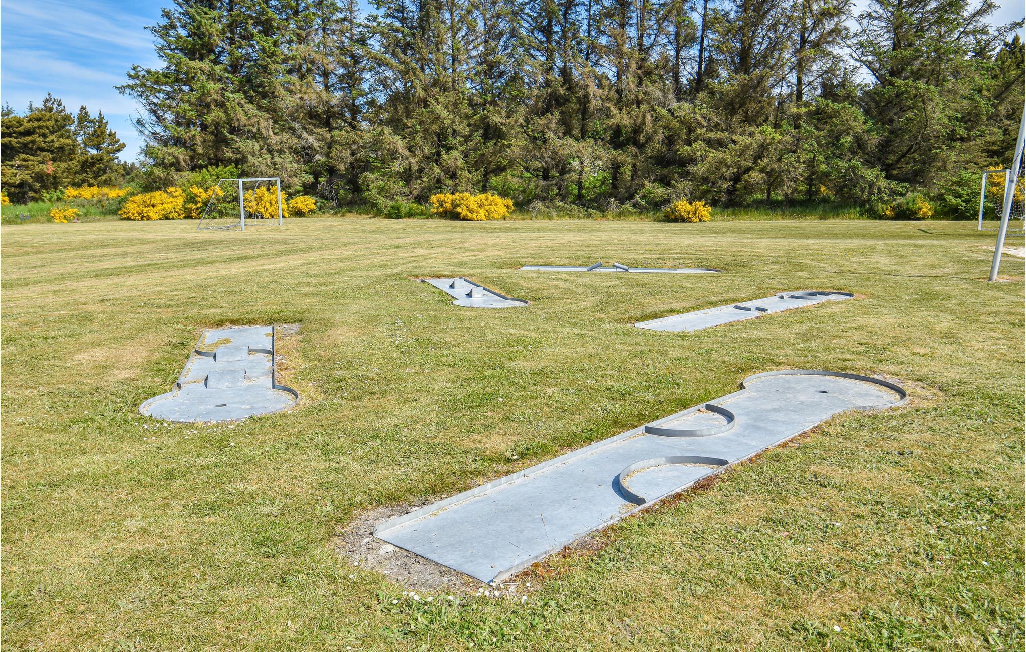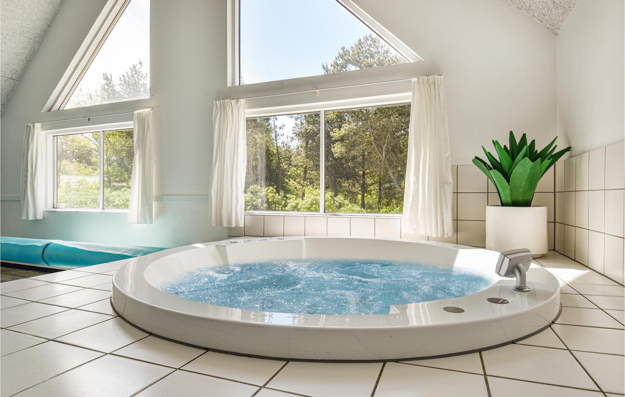 Dette fantastisk flotte luksushus har en skøn beliggenhed på en stor naturgrund kun 1200 meter fra Vesterhavet. Der er tale om et arkitektonisk spændende hus af kvalitetsmæssig høj standard. Det 290 kvadratmeter store feriehus har plads og faciliteter til 20 personer. F.eks. er der fire skønne badeværelser, otte soveværelser og to hemse. Den skønne poolafdeling indeholder udover den store swimmingpool et seks personers spabad og en sauna. Desuden er der et aktivitetsrum med bl.a. bordtennis- og poolbord. Midt i huset ligger den store, flotte opholds- og spisestue og det fuldt udstyrede og meget elegante køkken, der er indrettet med ekstra opvaskemaskine, komfur og køleskab. Huset har en pragtfuld stor terrasse, der ligger i god læ af huset. Til huset hører en fem hullers minigolfbane. I nærheden er der talrige aktivitetsmuligheder som f.eks. golf og fiskeri.