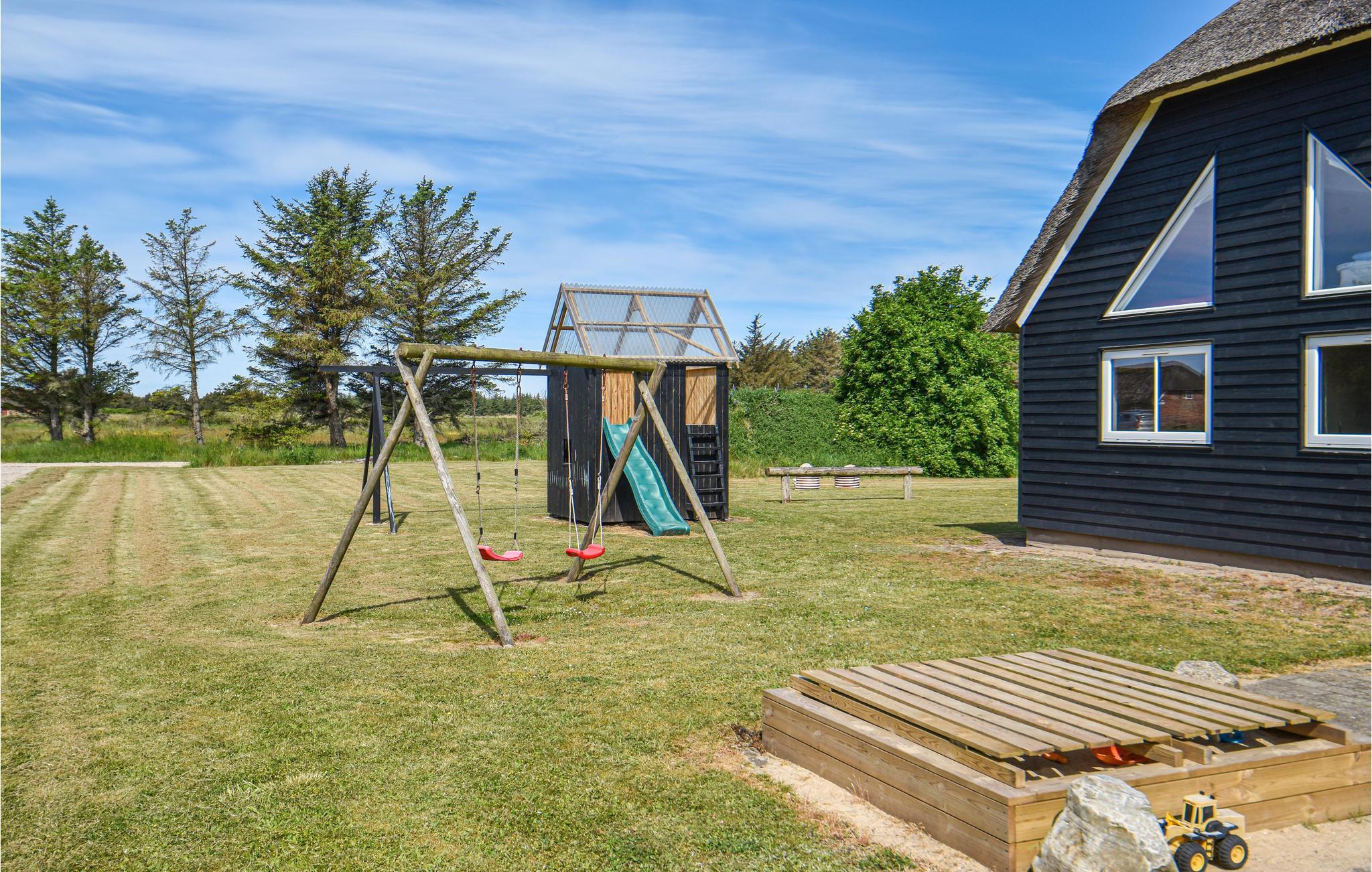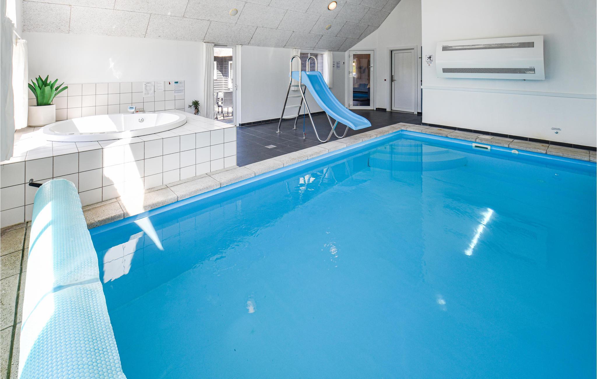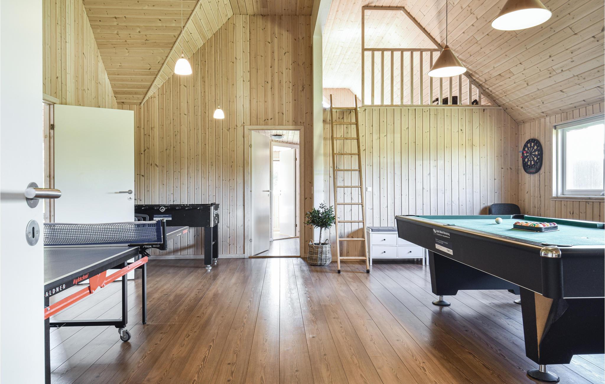 Dette fantastisk flotte luksushus har en skøn beliggenhed på en stor naturgrund kun 1200 meter fra Vesterhavet. Der er tale om et arkitektonisk spændende hus af kvalitetsmæssig høj standard. Det 290 kvadratmeter store feriehus har plads og faciliteter til 20 personer. F.eks. er der fire skønne badeværelser, otte soveværelser og to hemse. Den skønne poolafdeling indeholder udover den store swimmingpool et seks personers spabad og en sauna. Desuden er der et aktivitetsrum med bl.a. bordtennis- og poolbord. Midt i huset ligger den store, flotte opholds- og spisestue og det fuldt udstyrede og meget elegante køkken, der er indrettet med ekstra opvaskemaskine, komfur og køleskab. Huset har en pragtfuld stor terrasse, der ligger i god læ af huset. Til huset hører en fem hullers minigolfbane. I nærheden er der talrige aktivitetsmuligheder som f.eks. golf og fiskeri.
