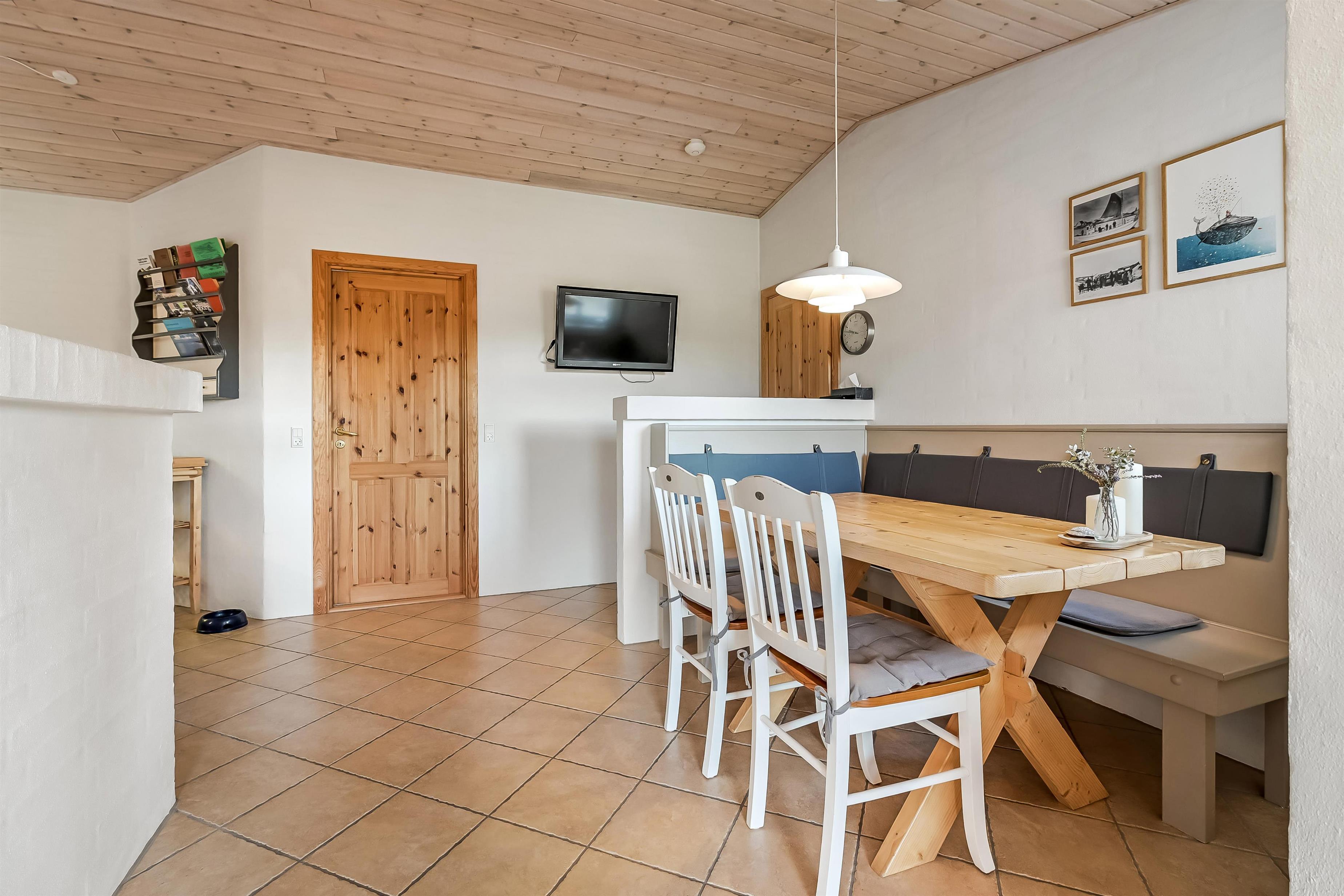 Feriehuset er indrettet med sans for kvalitet og funktionalitet. Den lyse entre har klinkegulv, vaskemaskine og tørretumbler, og det rummelige køkken byder på god bordplads og alt, hvad du har brug for – bl.a. opvaskemaskine.