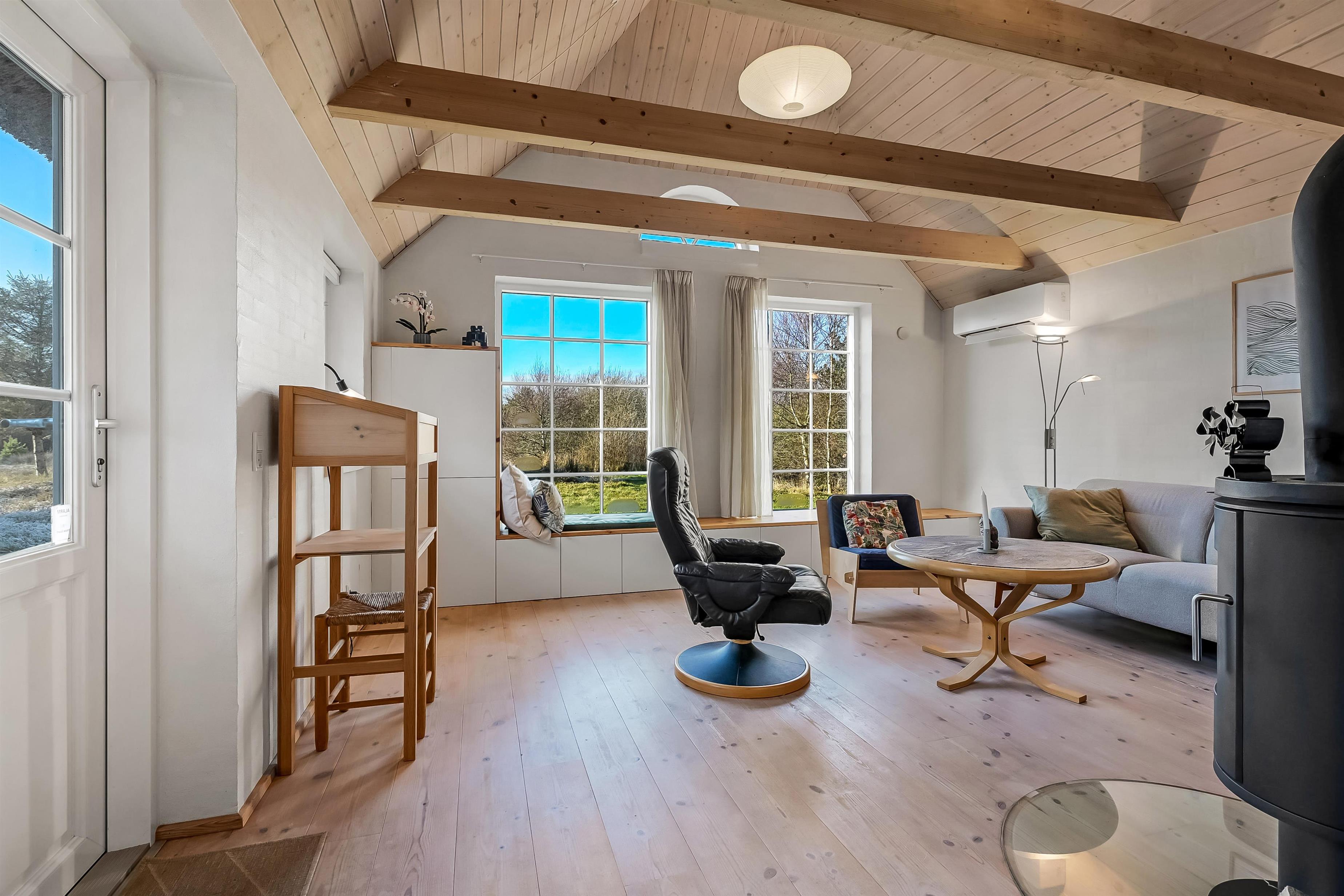 Køkkenet ligger i åben forbindelse med stuen, hvor der er spiseplads, brændeovn og et hyggeligt opholdsområde med komfortable møbler og flot udsigt til naturen udenfor.